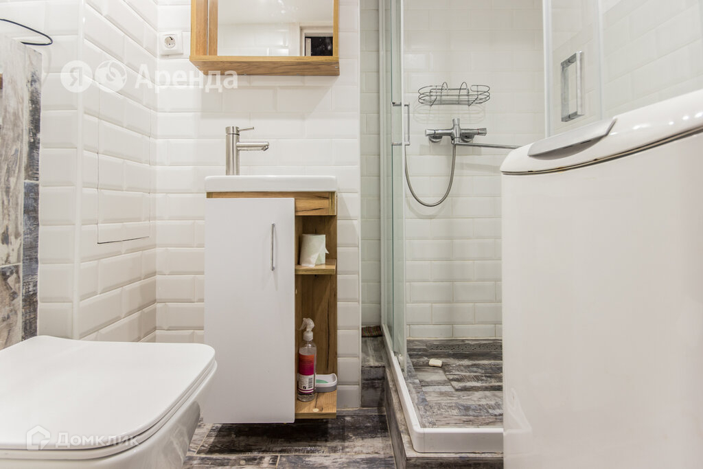· Совмещенный санузел с душевой кабиной. Стиральная машина, навесной шкаф с зеркалом, раковина с тумбой, фен, зеркало, полотенцесушитель