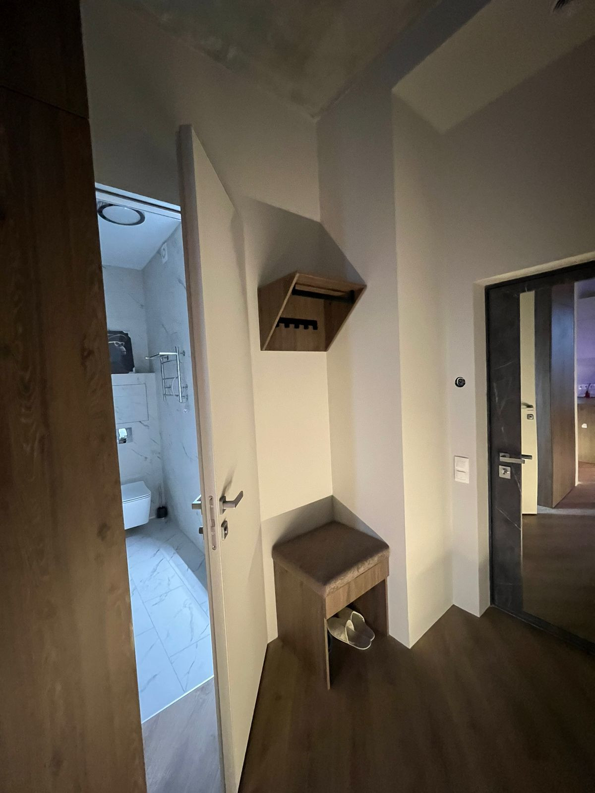 В прихожей открытые вешалки, вместительный шкаф и огромное зеркало.