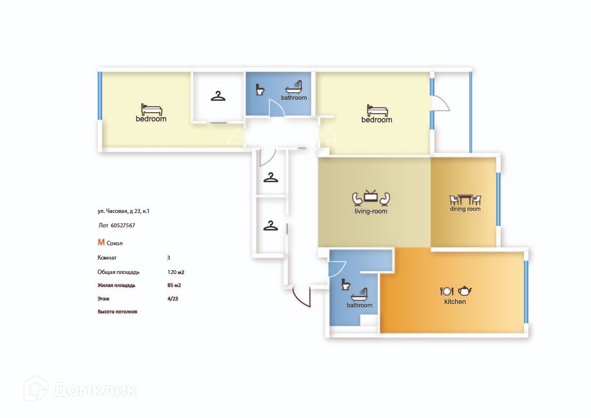 3-комнатная квартира, 120 м2, в аренду на длительный срок в Москве, Часовая улица, 23к1