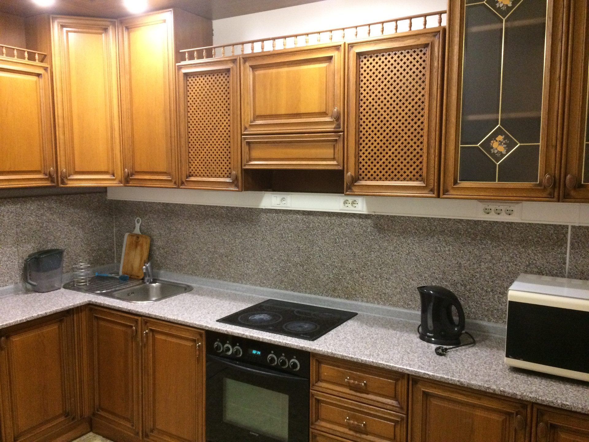 Есть всё в рабочем, исправном состоянии для комфортного проживания в квартире: один раскладывающийся диван-кровать, стиральная машина «BOSСH», красивая германская мебельная стенка, платяной шкаф и тумбочка для большого количества одежды и вещей, итальянский кухонный гарнитур ELT «Классика» - «Беатриче» (с подсветкой и вытяжкой), встроенная импортная техника: стеклокерамическая варочная панель с духовым шкафом «ARISTON»; холодильник «STINOL», микроволновая печь, кухонный стол с табуретами. Также есть раздельный санузел с мраморными полами и импортной сантехникой «ROCA», полы в комнате и коридоре - деревянный паркет, интернет-кабель в квартире. Окна – во двор.