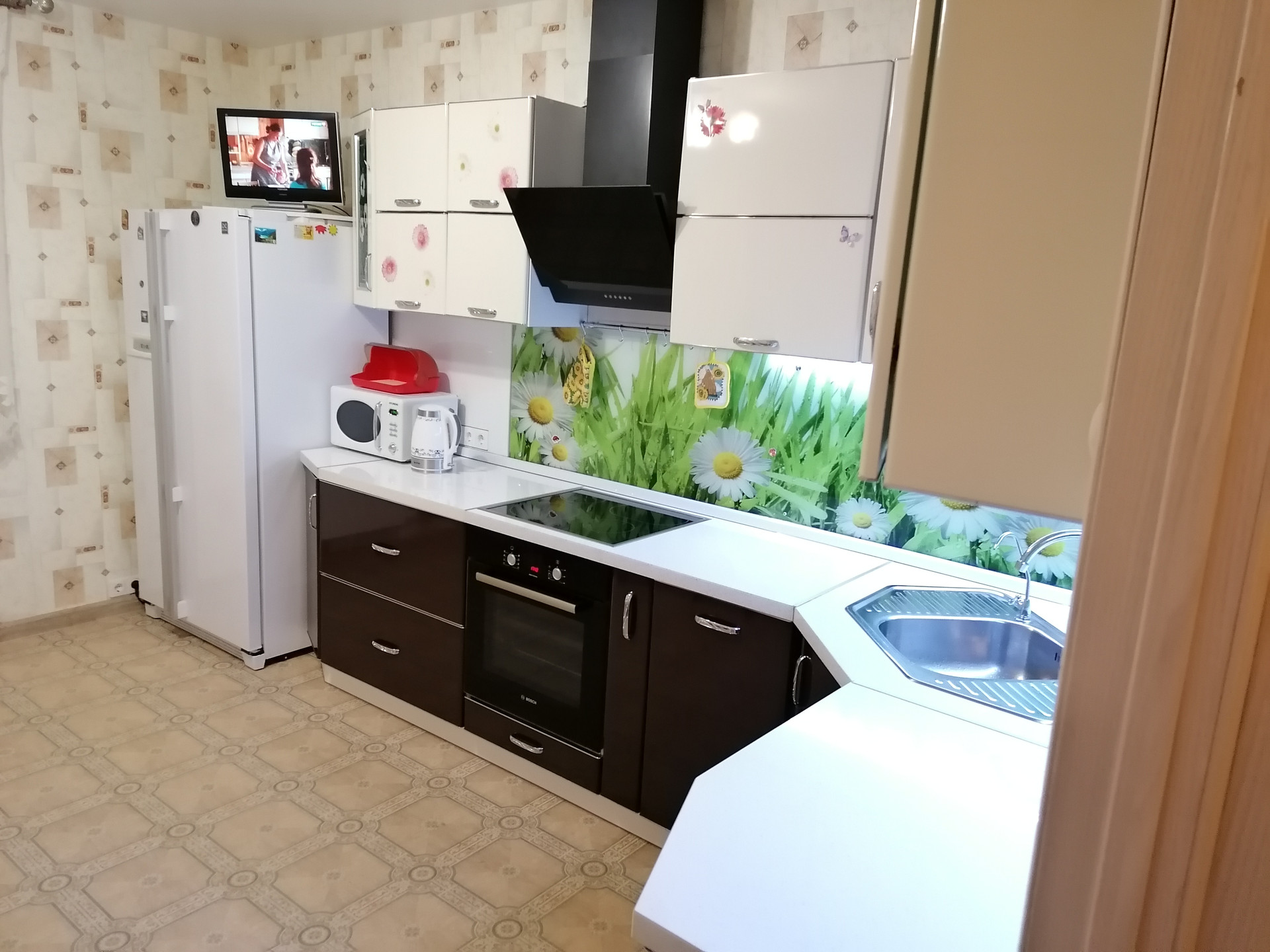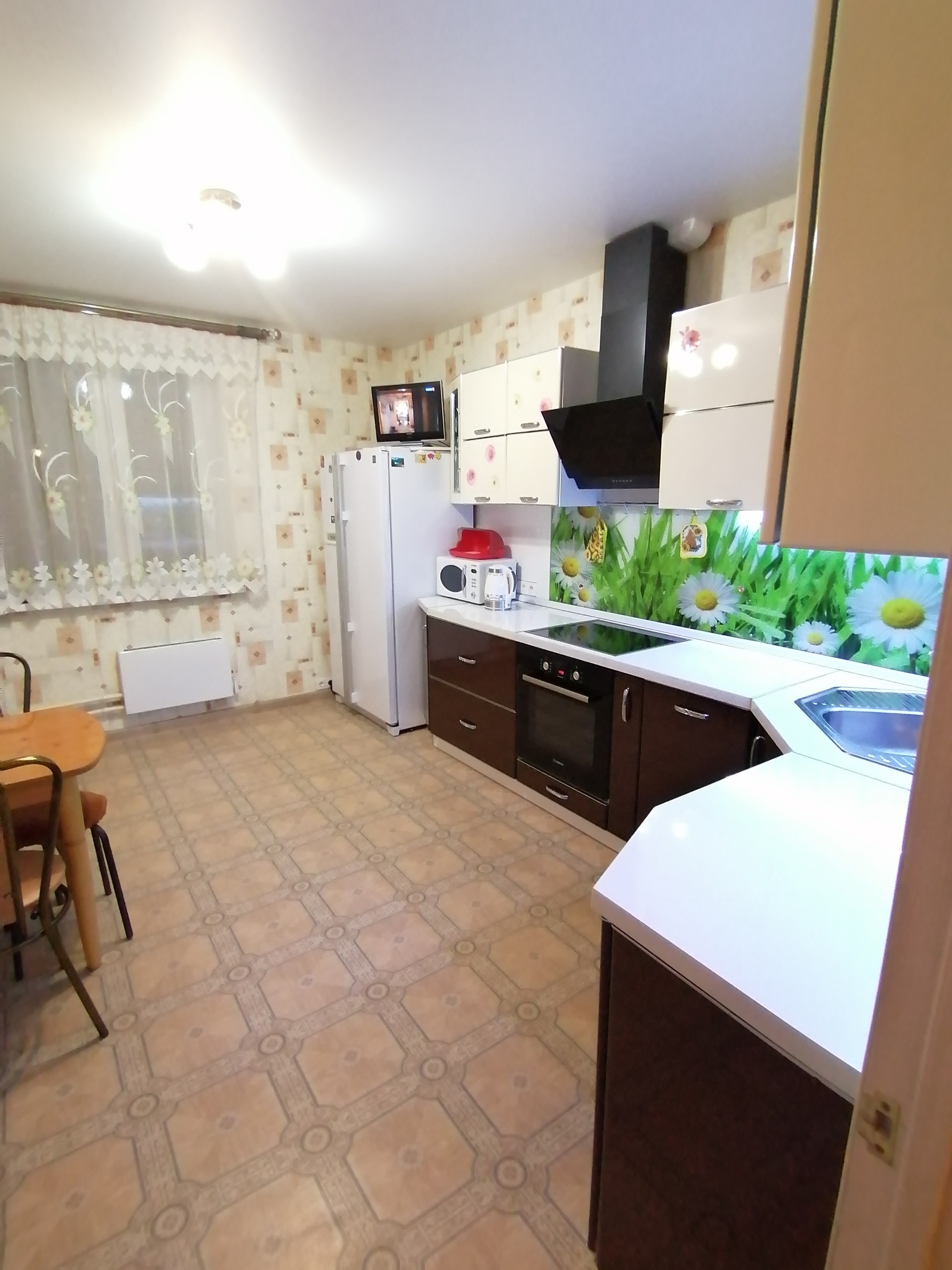 На кухне новый гарнитур под единой столешницей, варочная панель, духовой шкаф, обеденный стол, диван. Большой 2-х дверный холодильник. Посудомоецная машина.