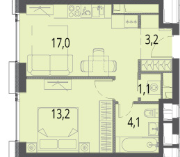 Функциональная планировка: кухня-гостиная + спальня, с/у совмещённый.