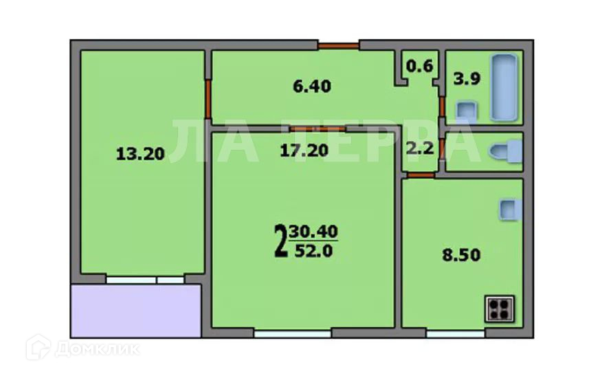 Общая площадь квартиры - 52 м2, комнаты - 17.2 и 13.2 м2, кухня – 8.5 м2. Ванна и санузел раздельные. Потолки – 2,64 м.