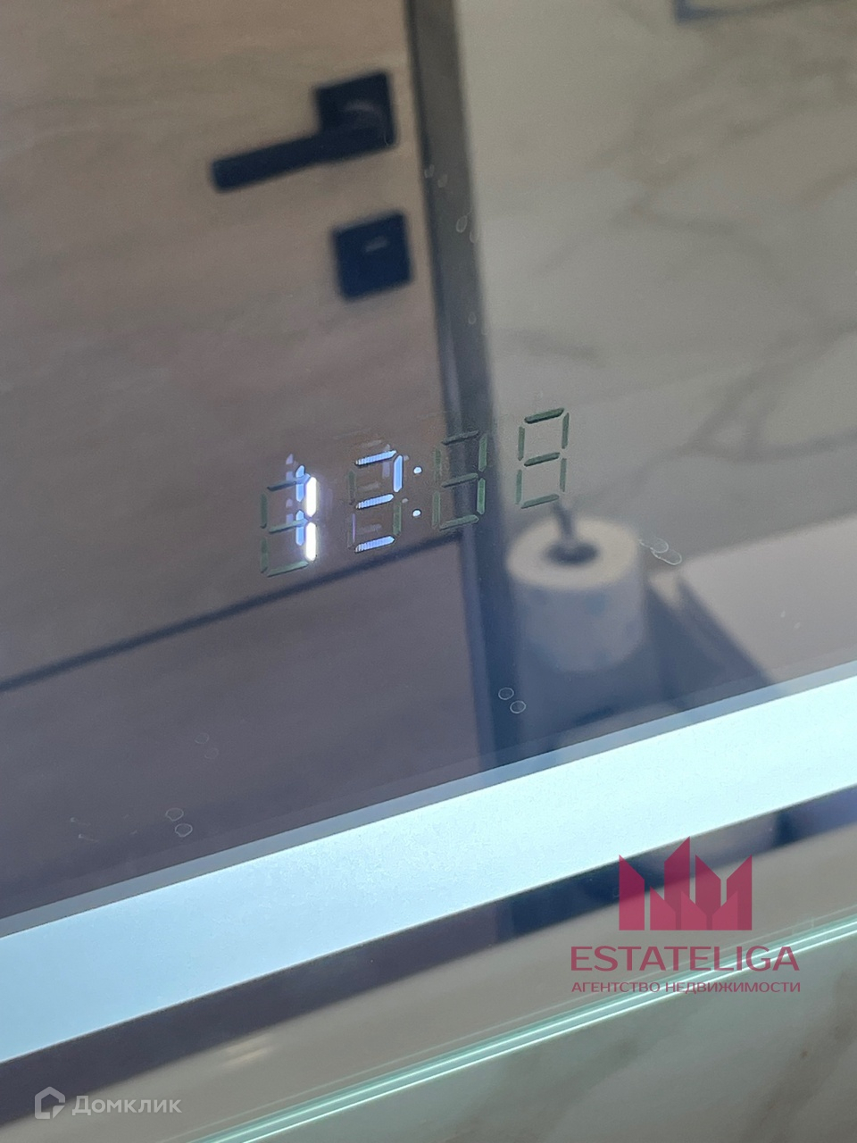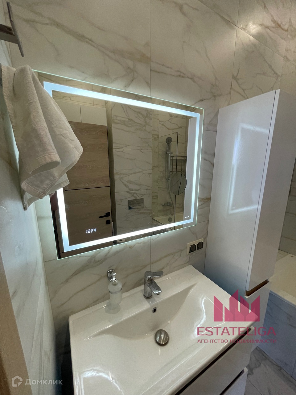 - Большое зеркало с подсветкой в ванной комнате, просторная ванная.
