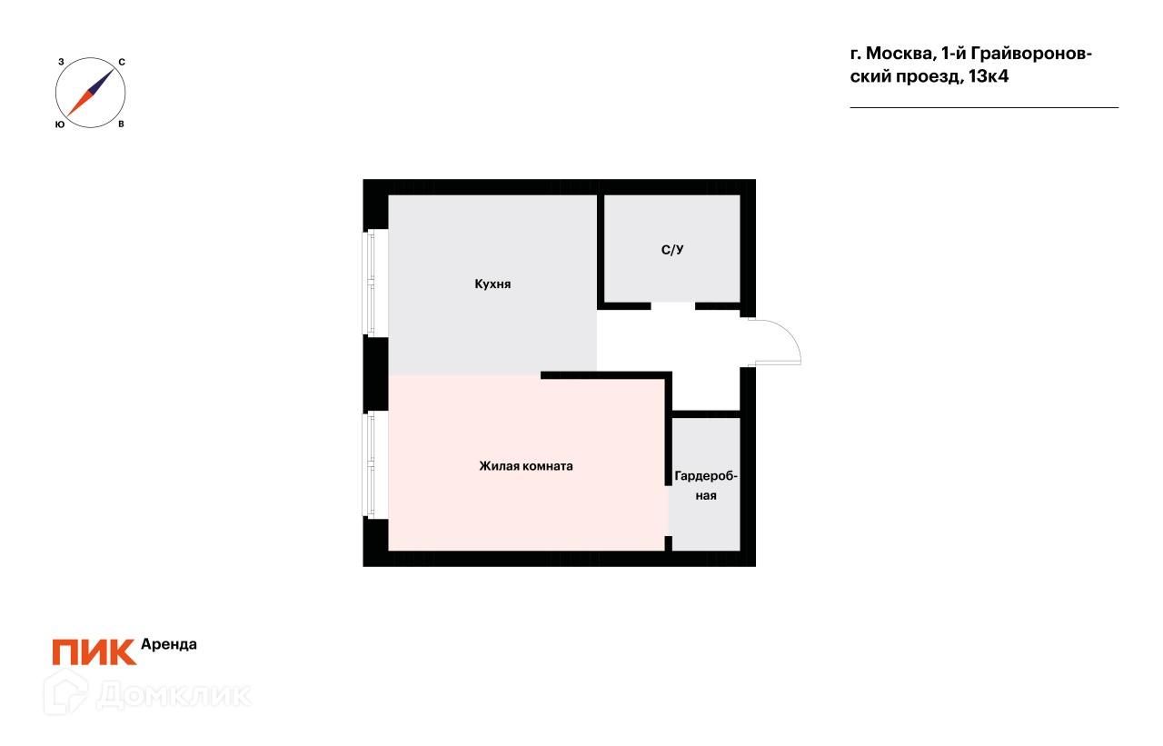 1-комнатная квартира, 31.5 м2, в аренду на длительный срок в Москве, 1-й Грайвороновский проезд, 13к4