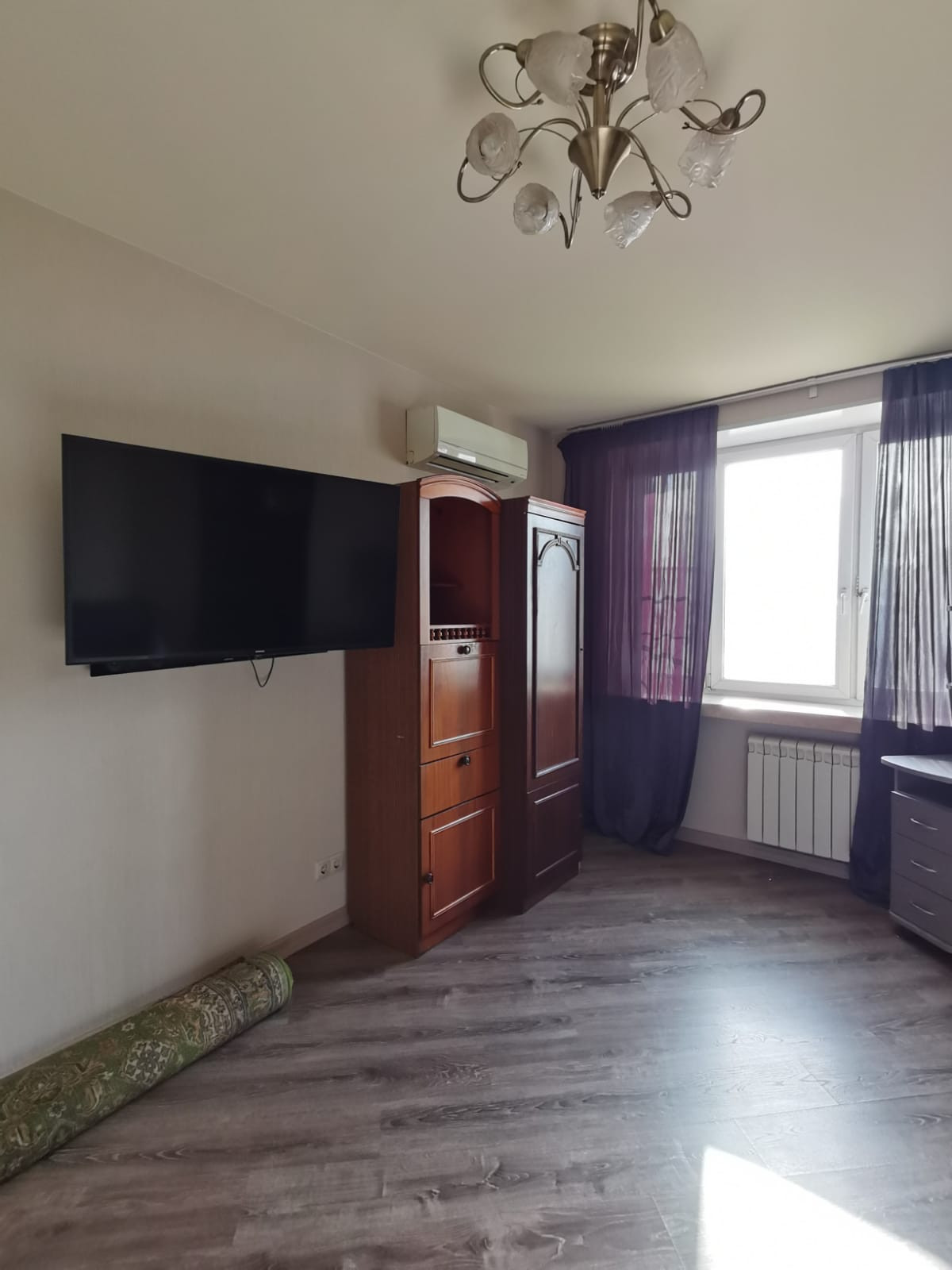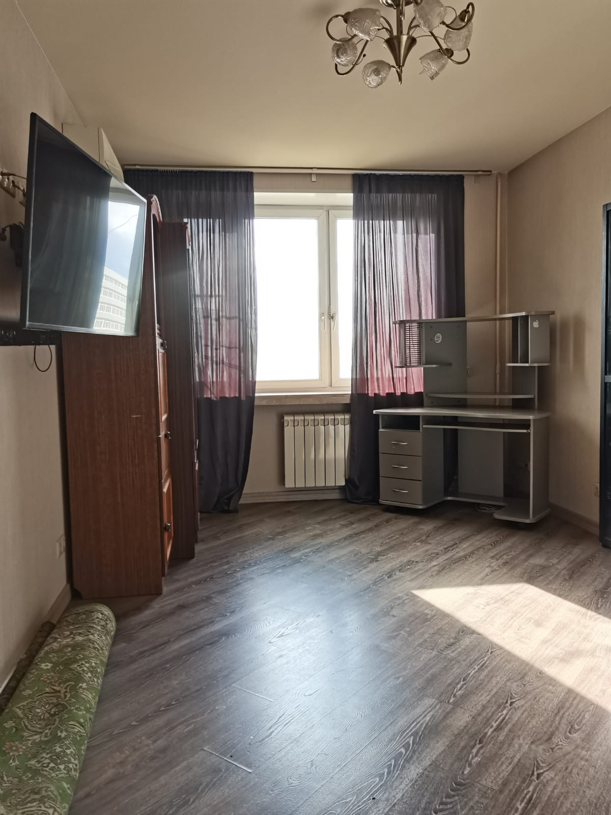 В комнате - раскладной диван,компьютерный стол,TV -плазма,три шкафа .