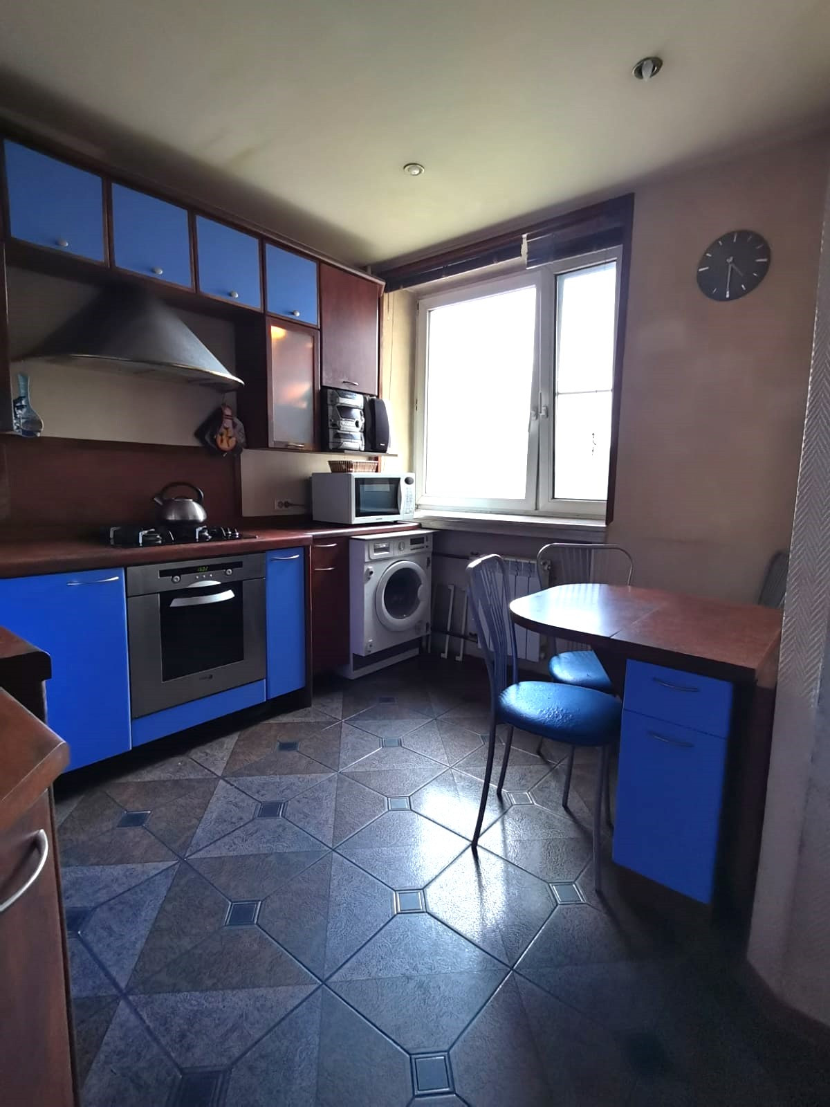На кухне - кухонный гарнитур,шкафы под единой столешницей,газовая плита, электрическая духовка,вытяжка,посудомоечная машина,стиральная машина -автомат,