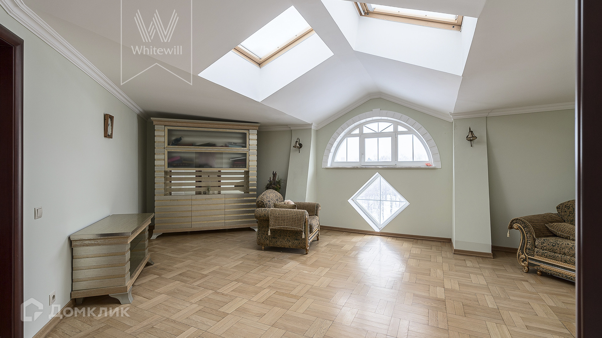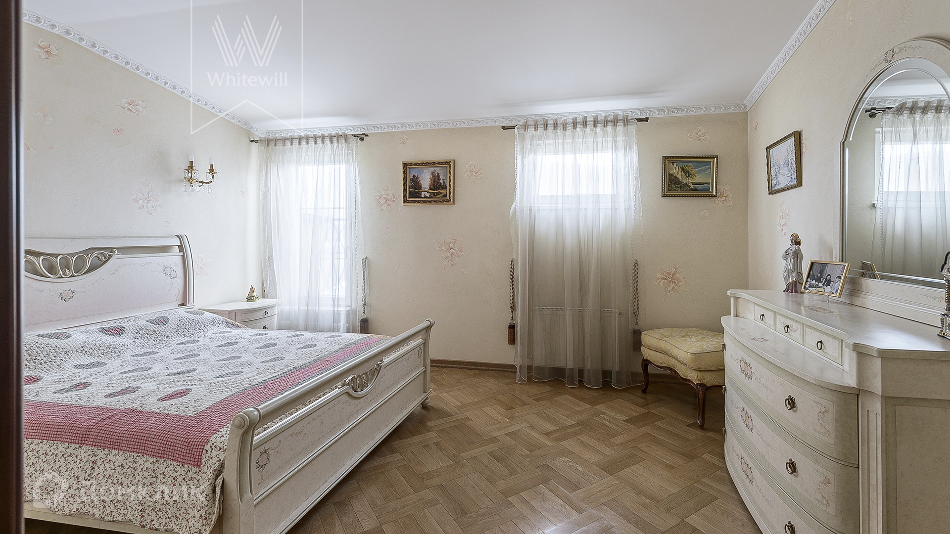 ID 1 995. С коллегами работаем 50/50. Двухуровневая квартира с 3-мя спальнями общей площадью 250 м² в элитном посёлке «Мещерский». Квартира расположена на последнем этаже. Интерьер оформлен в дворцовом стиле в теплых тонах с использованием ценных пород дерева, украшен колоннами и пилястрами с лепниной, хрустальными люстрами. В гостиной установлен камин.