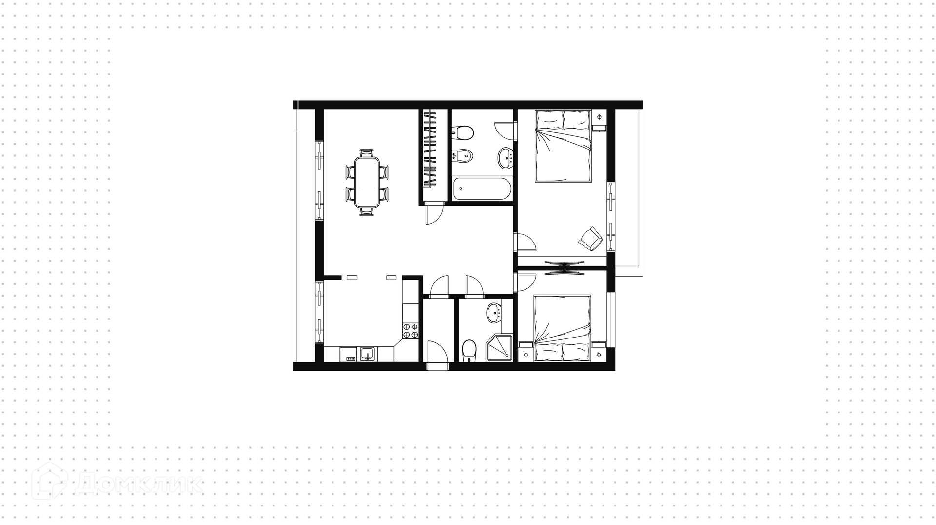 Планировка: кухня-гостиная, спальня с ванной комнатой и выходом на балкон, вторая спальня, гостевой санузел, гардеробная комната, холл. Из кухни и гостиной спланирован выход на общую террасу. Окна ориентированы на две стороны света. Из квартиры открывается панорамный вид на город и территорию комплекса.