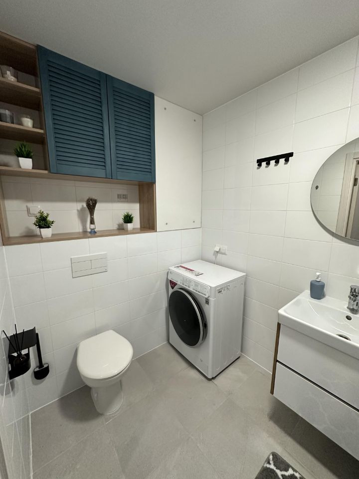 Квартира состоит из двух изолированных комнат, отдельной кухни совмещенной с гостиной, двух санузлов, совмещенного с ванной и гостевой. Много мест для хранения.
