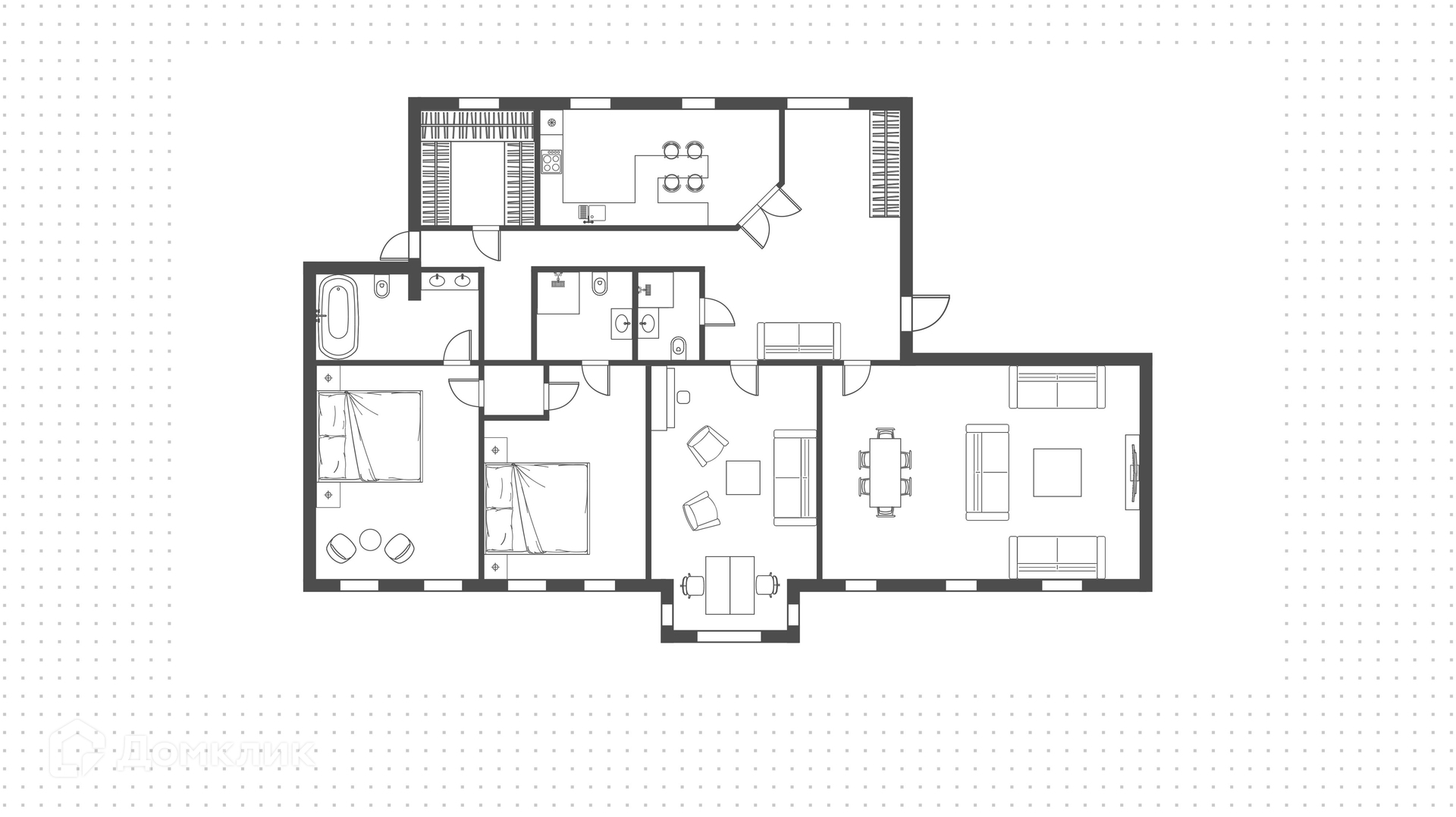 ID 1 153 Квартира с 3-мя спальнями общей площадью 232 м² расположена на 3 этаже. Выполнен современный ремонт, установлена премиальная мебель и бытовая техника. Планировка включает гостиную, кухню, 2 спальни с персональными санузлами, кабинет, который может быть переоборудован в спальню, гостевой санузел с душевой кабиной и гардеробную. Квартира с высокими потолками и просторными комнатами оснащена системой кондиционирования, датчиками дыма, теплыми полами.