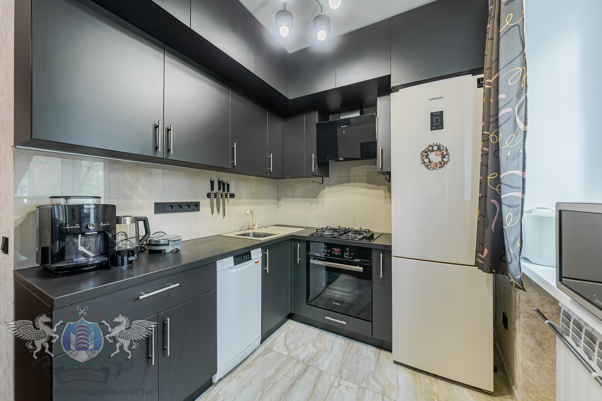 - Холодильник Samsung, вытяжка Weissgauff, газовая плита Hansa, посудомоечная машина Media, духовой шкаф Gefest, кофе-машина, микроволновая печь, вафельница и хлебопечь;