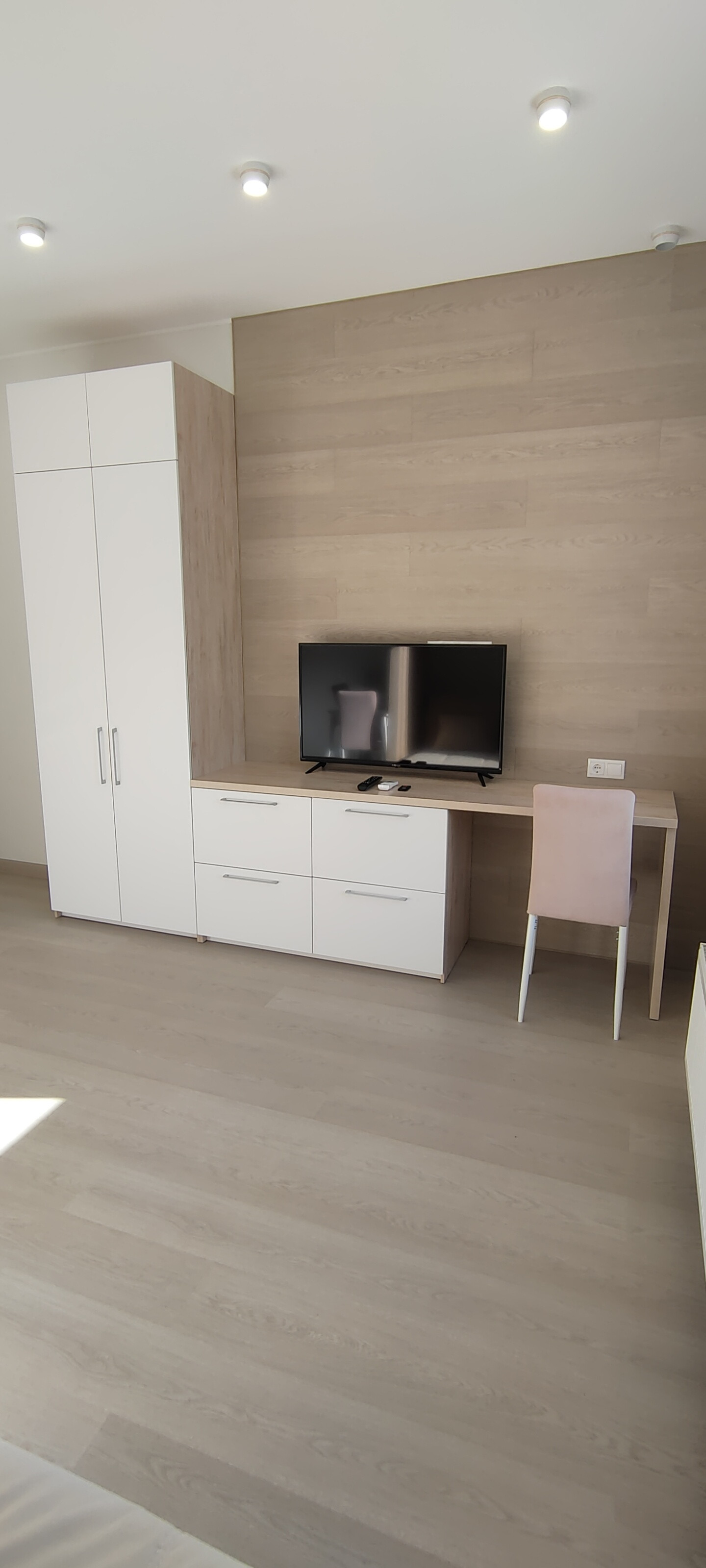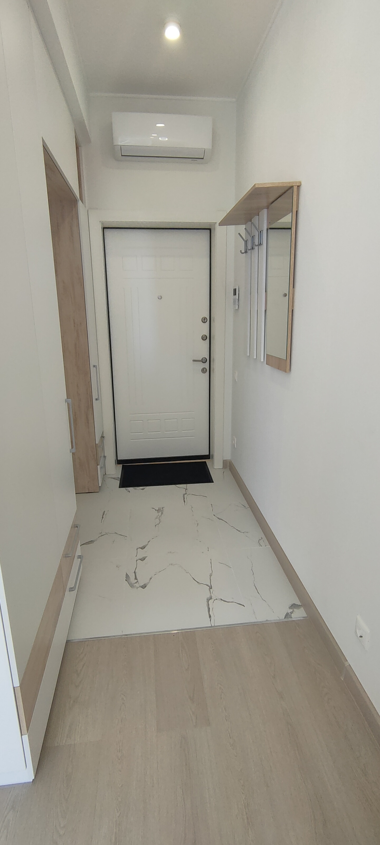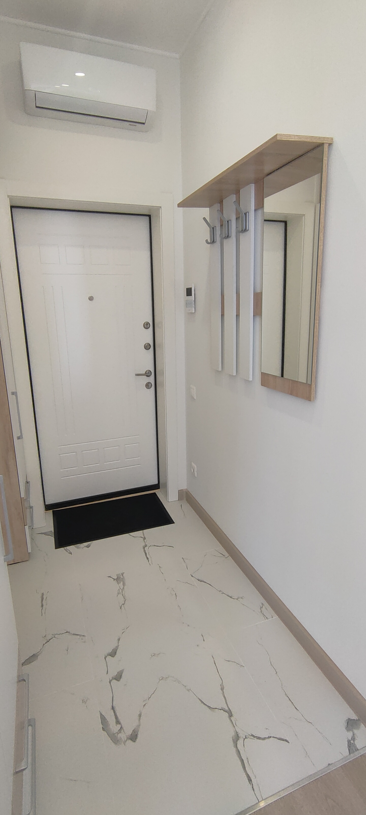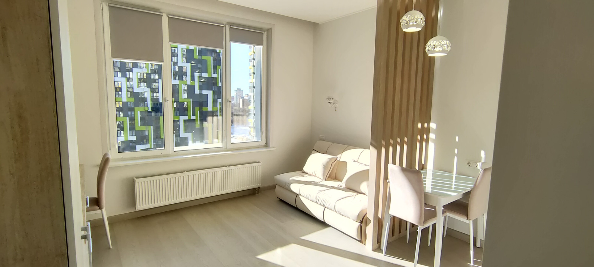 В апартаменте выполнена современная стильная отделка, вся мебель и техника новая. Имеется всё необходимое для комфортной жизни: встроенная мебель: шкафы для одежды со штангой, полками и ящиками, раскладной диван, жалюзи и шторы, телевизор 43 дюйма, оборудовано рабочее место с личной подсветкой. В кухонной зоне есть холодильник, стол и стулья, встроенный гарнитур с варочной панелью, посудомоечной машиной, микроволновой печью и вытяжкой. В санузле пол с подогревом, большая душевая кабина, зеркало с подсветкой, стиральная машинка. Также в помещении установлен кондиционер, видеодомофон, заведен скоростной интернет.