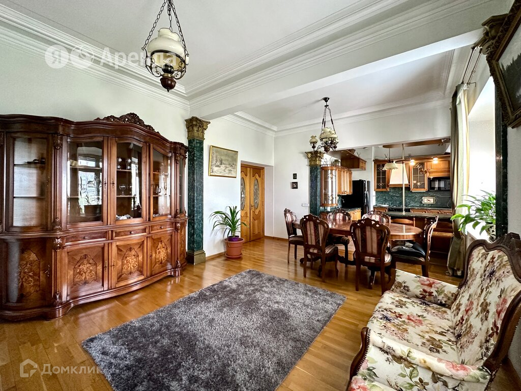 Мебель: кухонный гарнитур с островом, обеденная группа, деревянные лакированные буфет и тумба, журнальный столик из мрамора, раскладной диван, мебельная стенка, письменный стол, 2 двуспальные кровати с матрасами, 4 прикроватные тумбы, 2 комода с зеркалами, 2 шкафа-купе с зеркалами, платяной шкаф с зеркалами, стеклянная консоль с зеркалом во весь рост, пуф, плетёное кресло