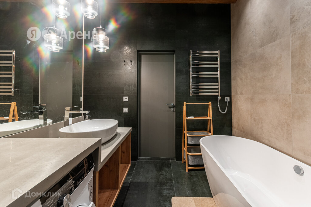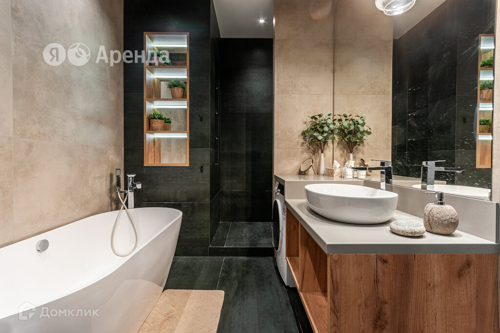 · Совмещённый санузел с ванной и душем. Тропический душ. Стиральная машина с функцией сушки, электрический полотенцесушитель. Гигиенический душ. Места для хранения, зеркало над раковиной