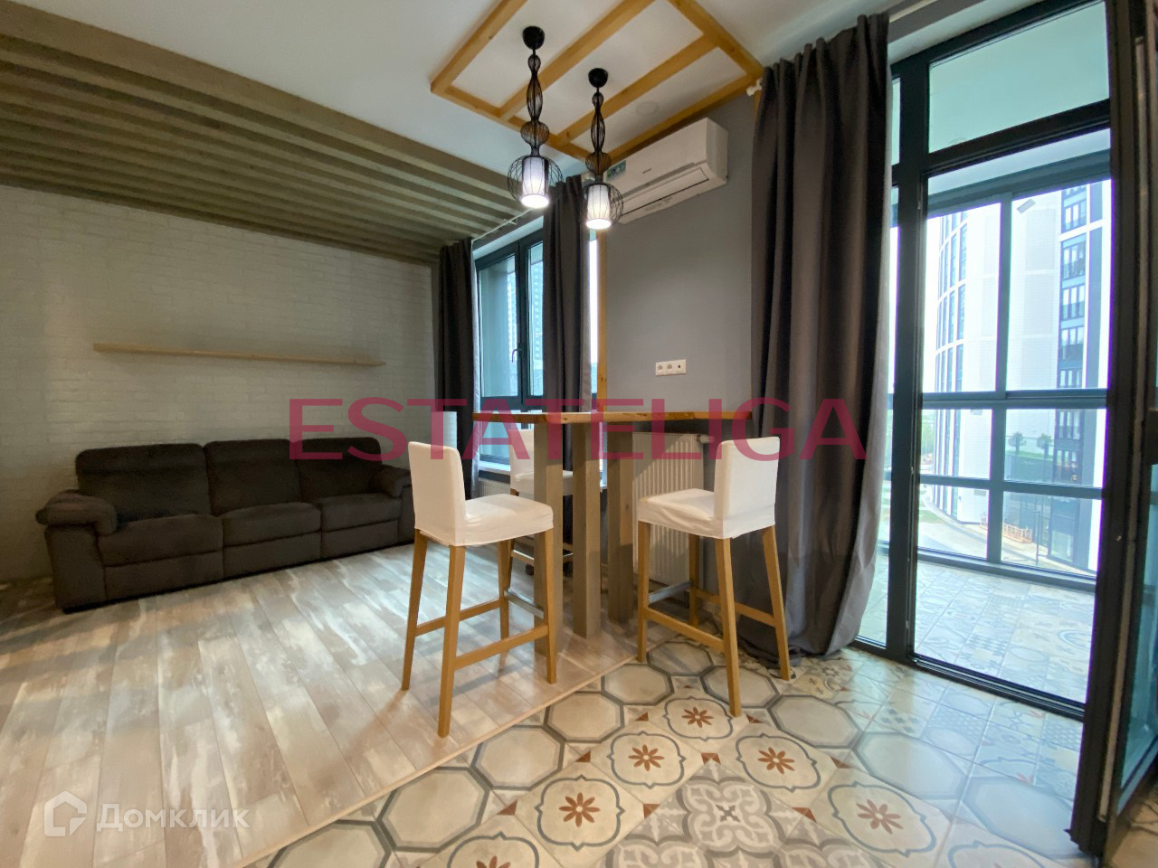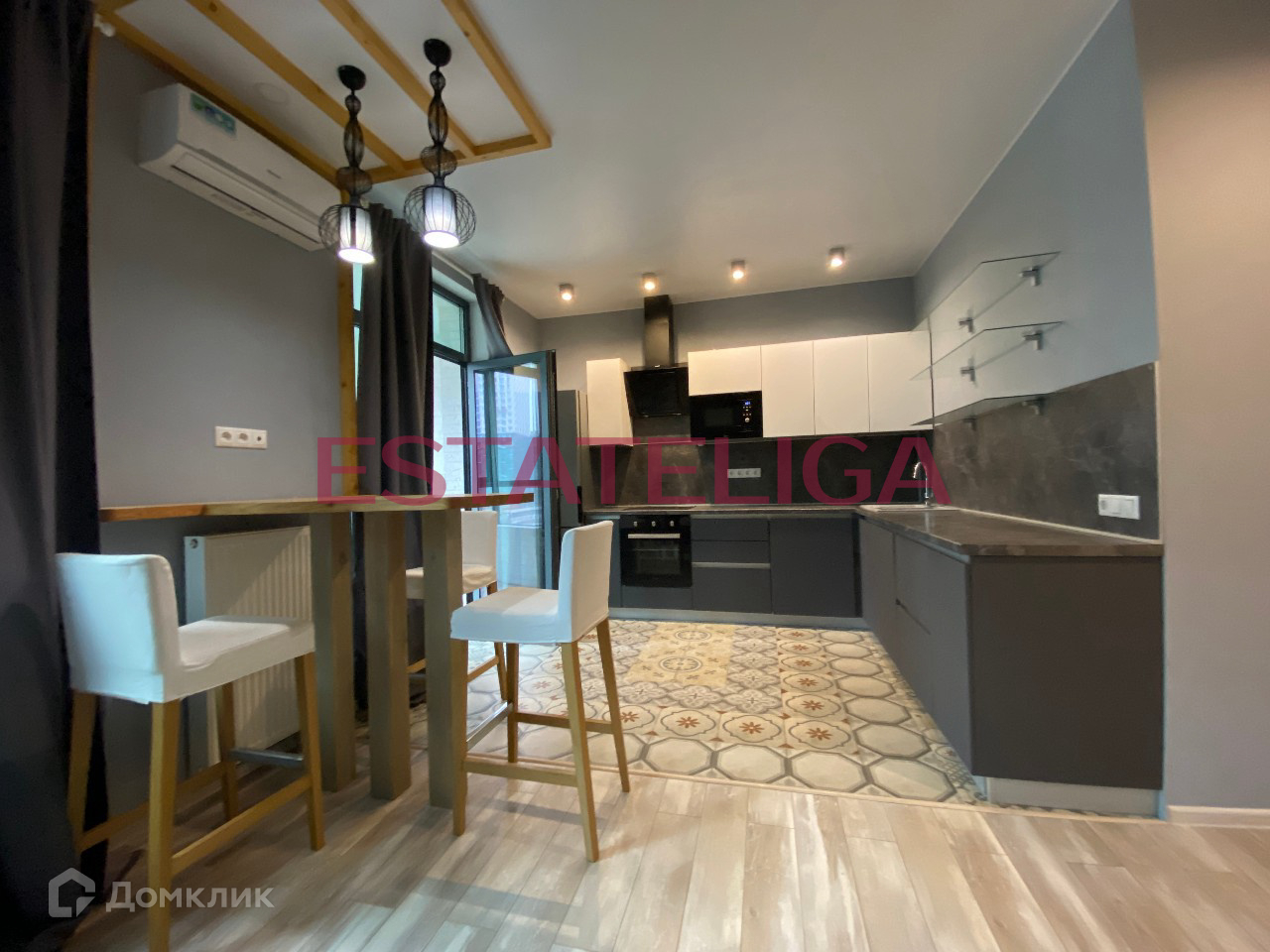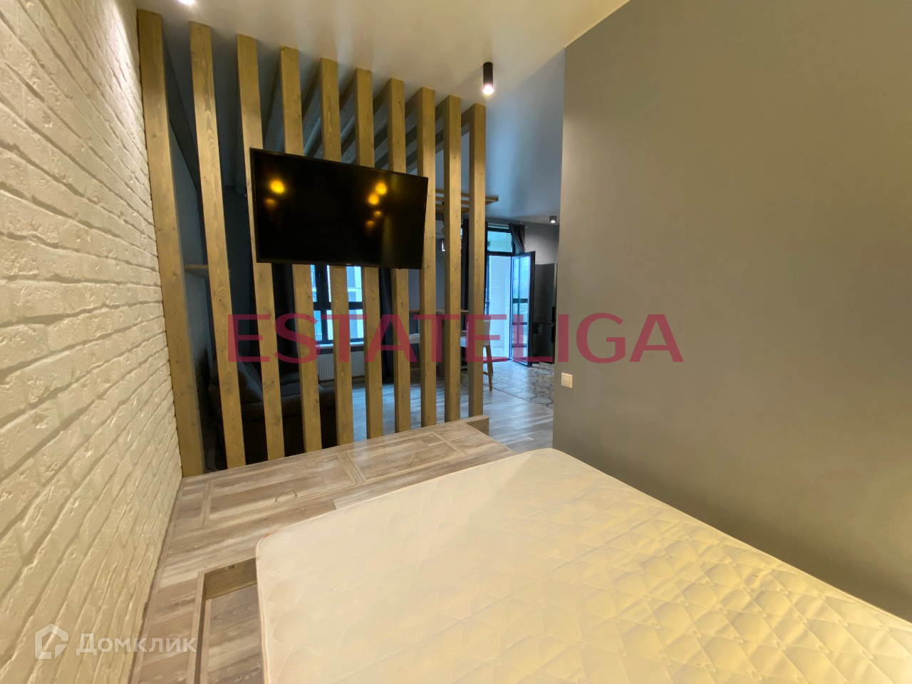 Функциональная планировка апартамента студийного типа, разработанная по индивидуальному дизайн-проекту: просторная кухня с обеденной зоной и кухонным гарнитуром и бытовой техникой (холодильник, духовой шкаф, микроволновка, посудомоечная машина), зона гостиной с диваном, огороженная спальная зона с телевизором и ящиками для хранения, полностью укомплектованный совмещенный санузел, отдельная гардеробная комната, просторный балкон с панорамным остеклением. Установлен кондиционер, теплые полы.