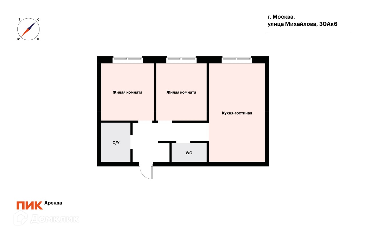 2-комнатная квартира, 66.5 м2, в аренду на длительный срок в Москве, улица Михайлова, 30Ак6