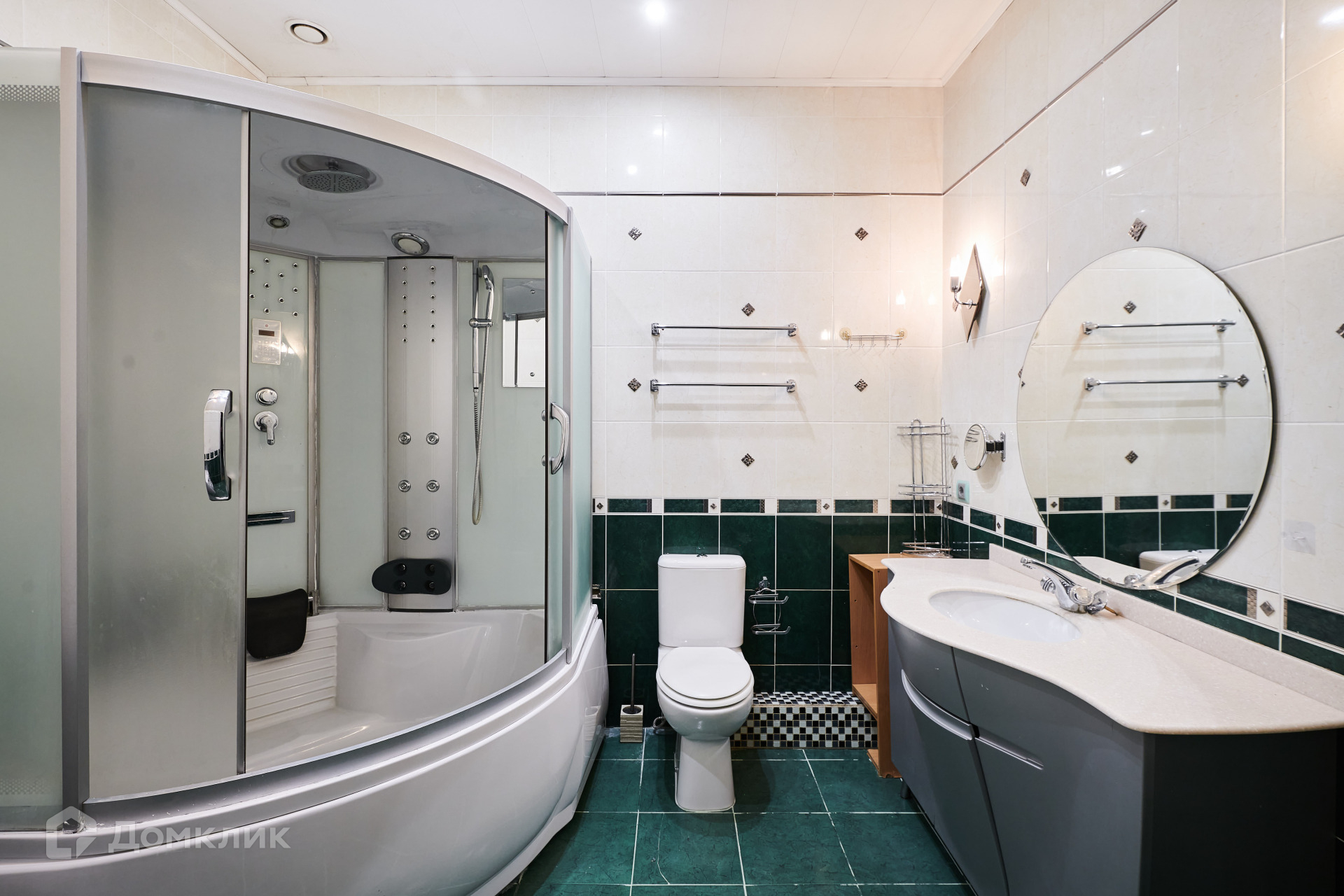 Планировка включает в себя гостиную, объединенную со столовой и кухней, а также спальню, детскую комнату и кабинет. В наличии два полноценных санузла, один из которых оснащен большой 1,5 на 1,5 метровой душевой кабиной с гидромассажем и паром, а второй предоставляет простую душевую кабину. Просторный холл также имеет большой шкаф.