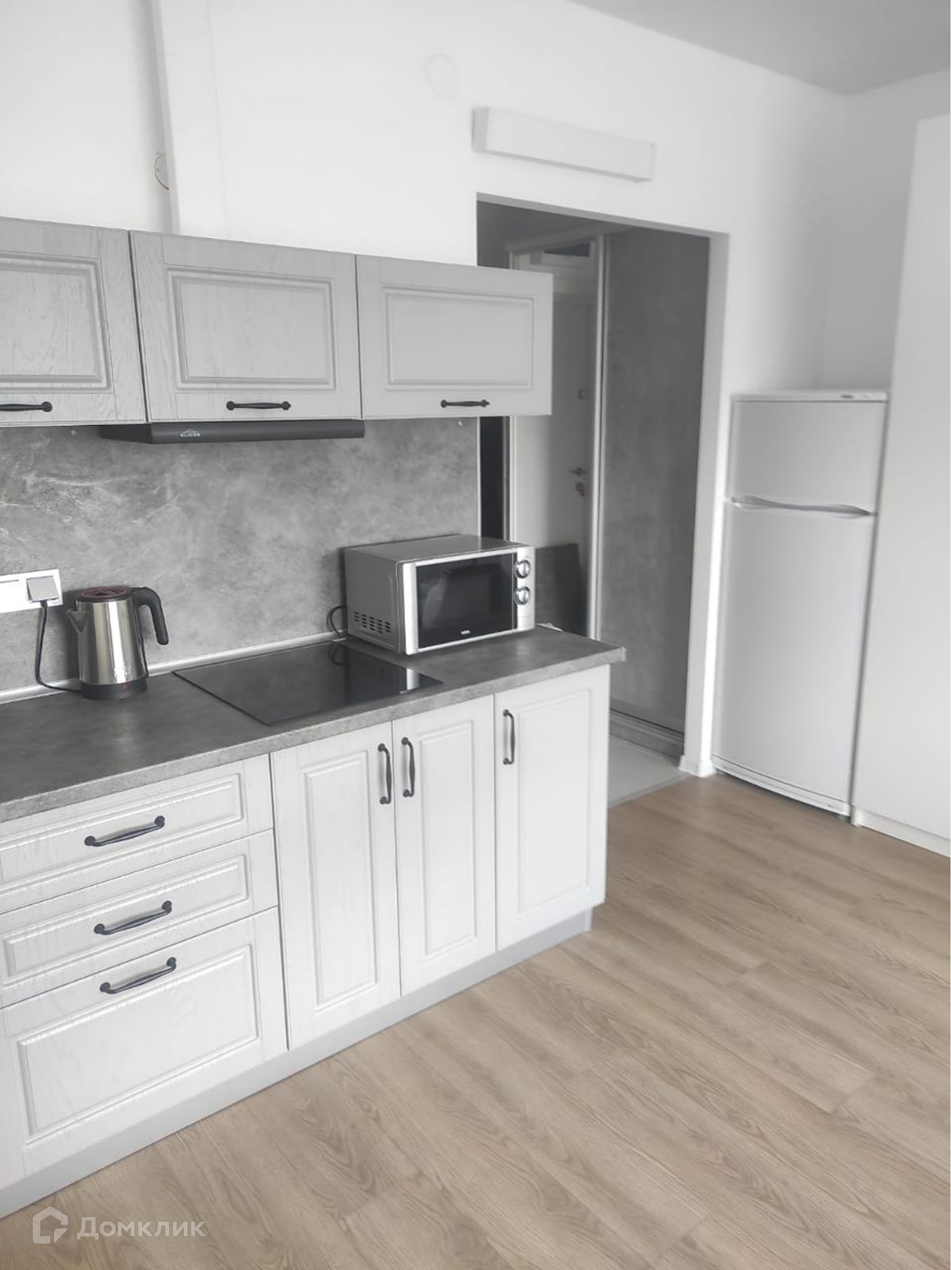 На кухне техника: варочная панель, микроволновая печь, чайник, холодильник