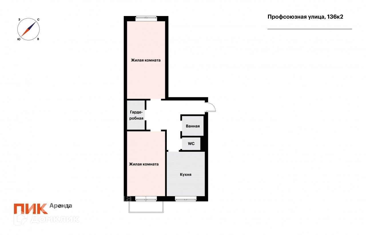 2-комнатная квартира, 46 м2, в аренду на длительный срок в Москве, Профсоюзная улица, 136к2