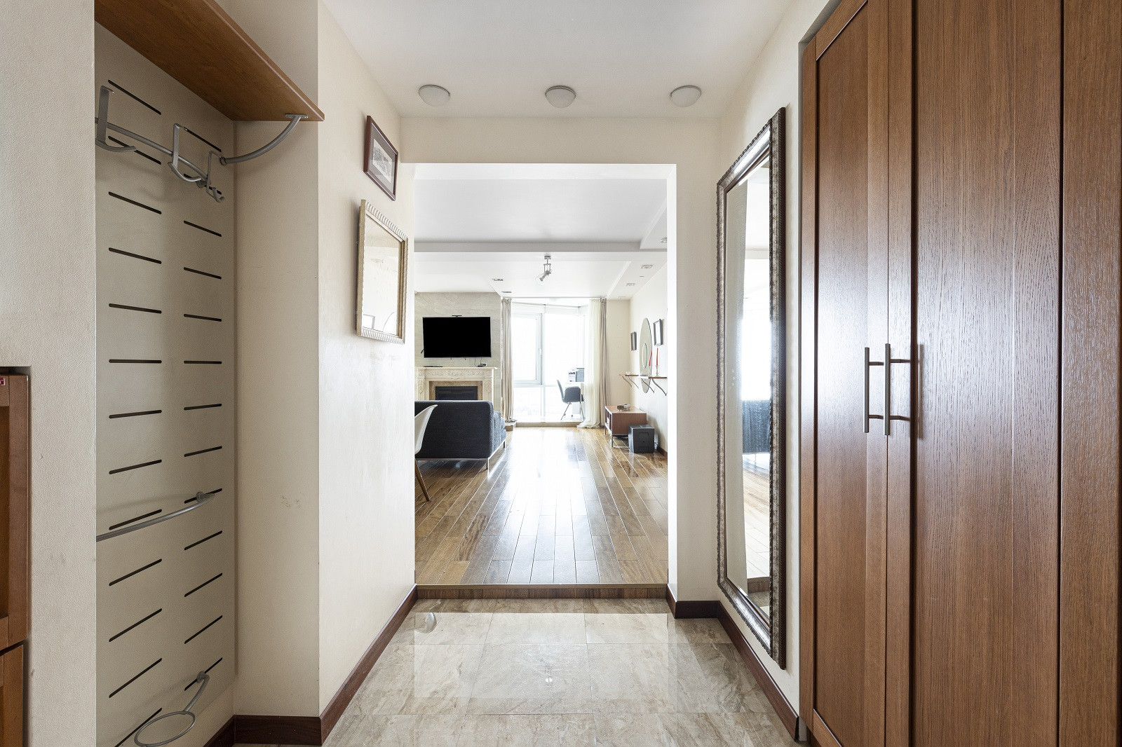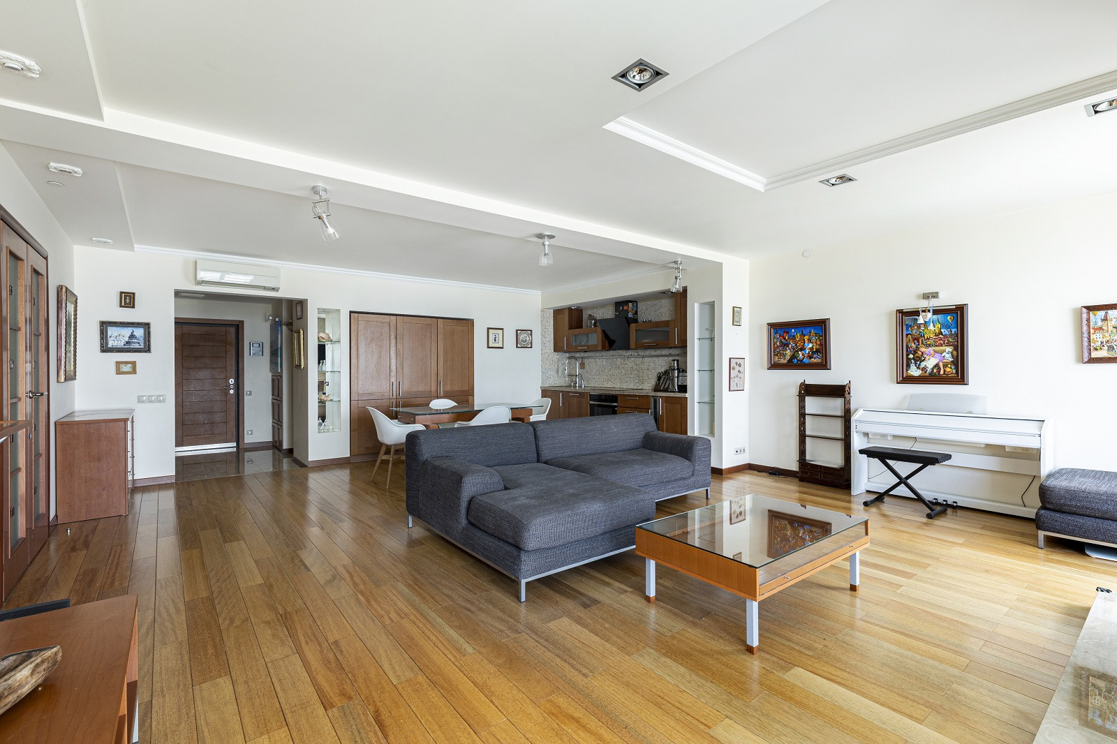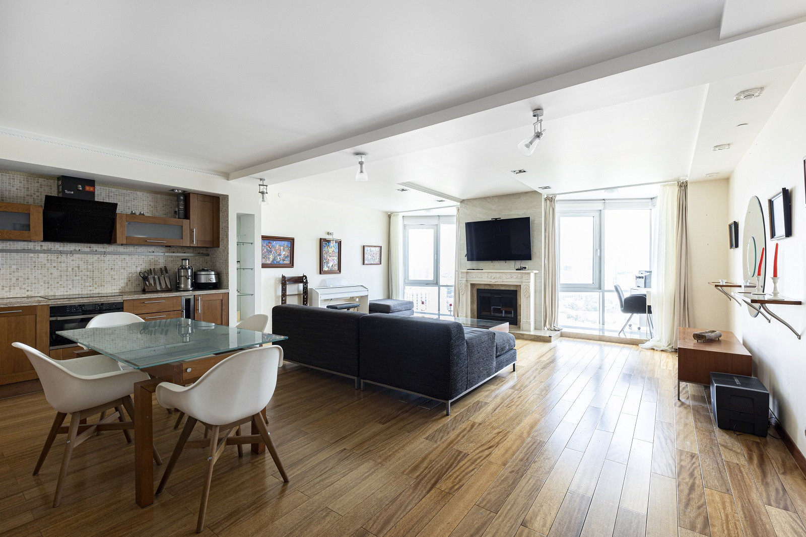 Просторная планировка: 3 изолированные комнаты, гардеробная, два санузла и роскошная гостиная. Полностью меблирована: со вкусом оформлена с использованием высококачественной бытовой техники Liebhaber и Kuppersbusch.