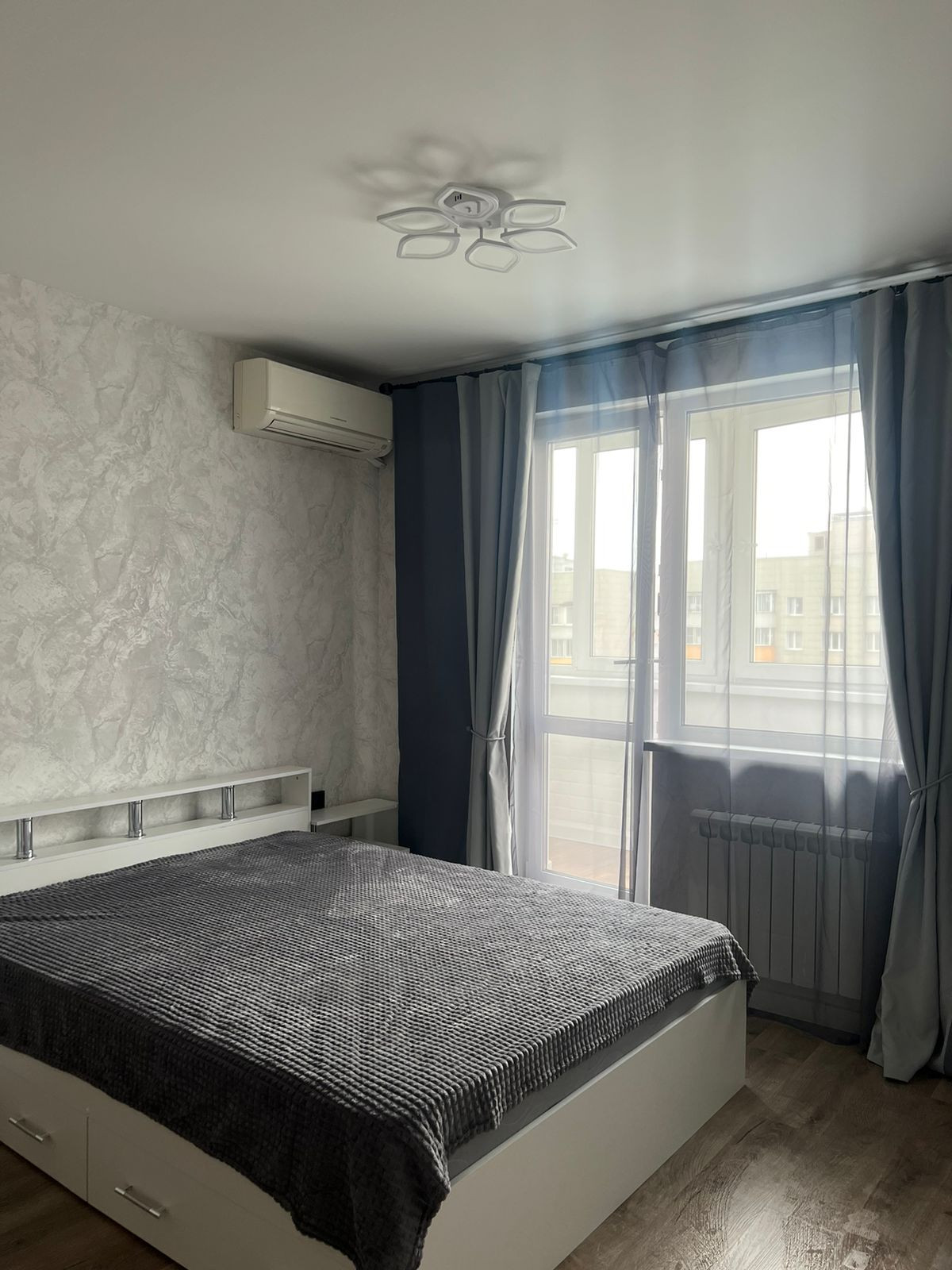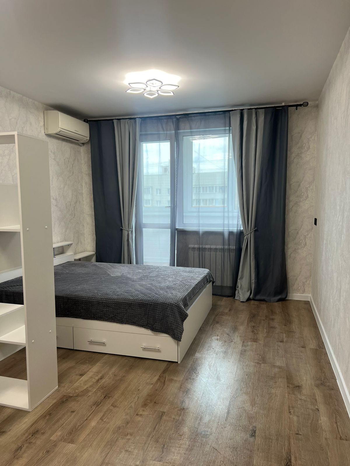 Просторная комнаты полностью меблирована: имеются мягкий раскладной диван, двуспальная кровать, практичные системы хранения, включая несколько шкафов с зеркалами, кондиционер, телевизор. Обустроена светлая спальня с выходом на застекленный балкон, пол с подогревом. Стеклопакет Rehau, ламинат и светлые тона обоев. Вид из окон на «тихую Москву».