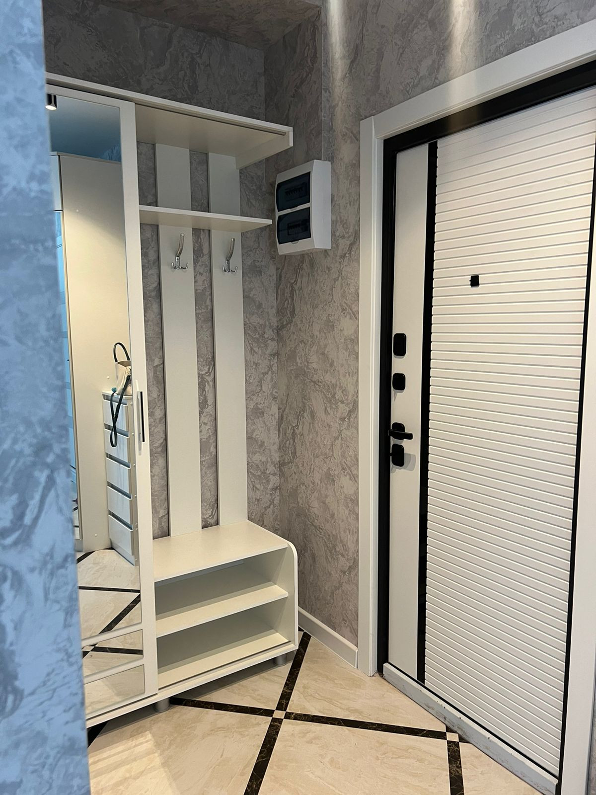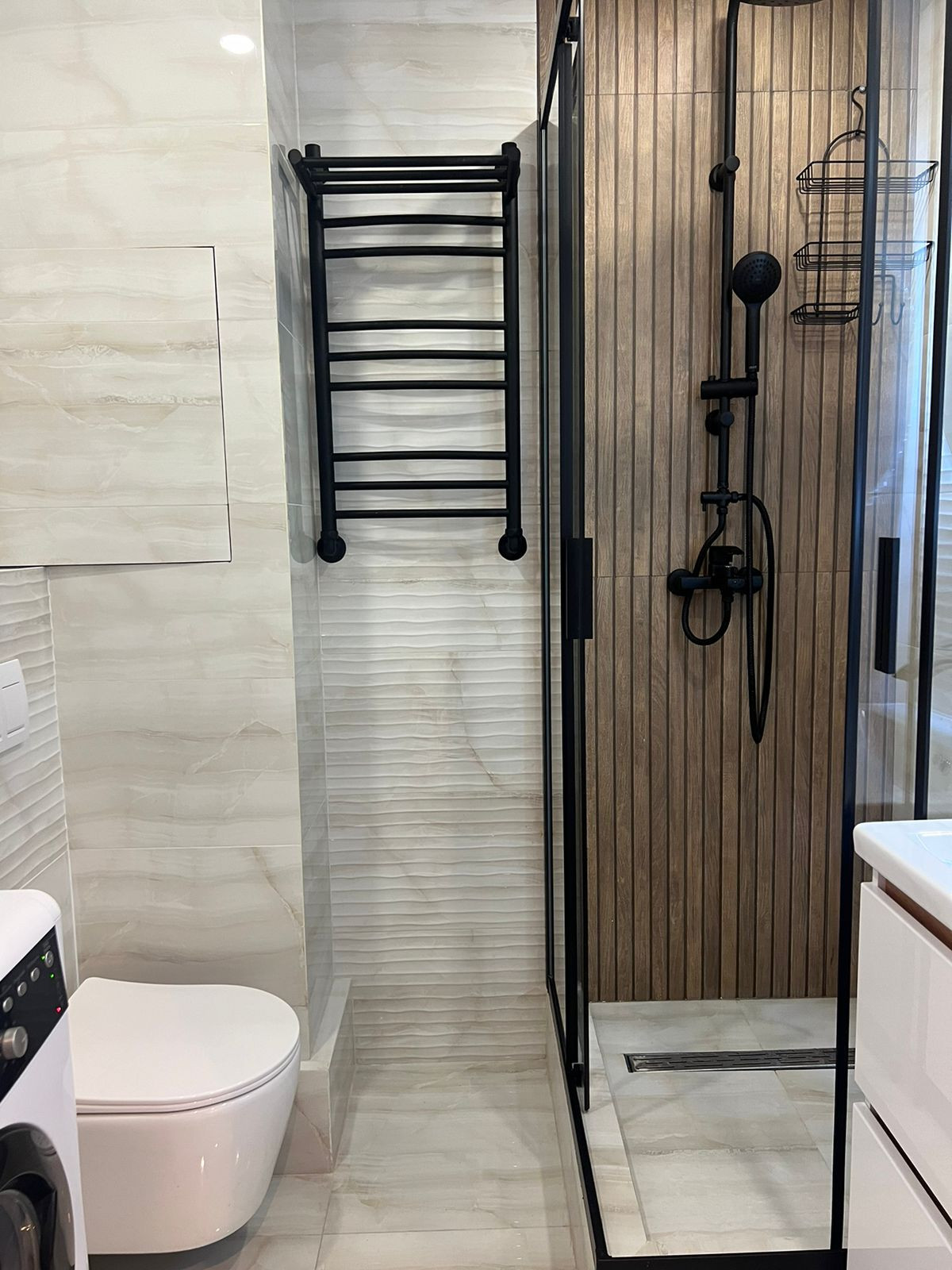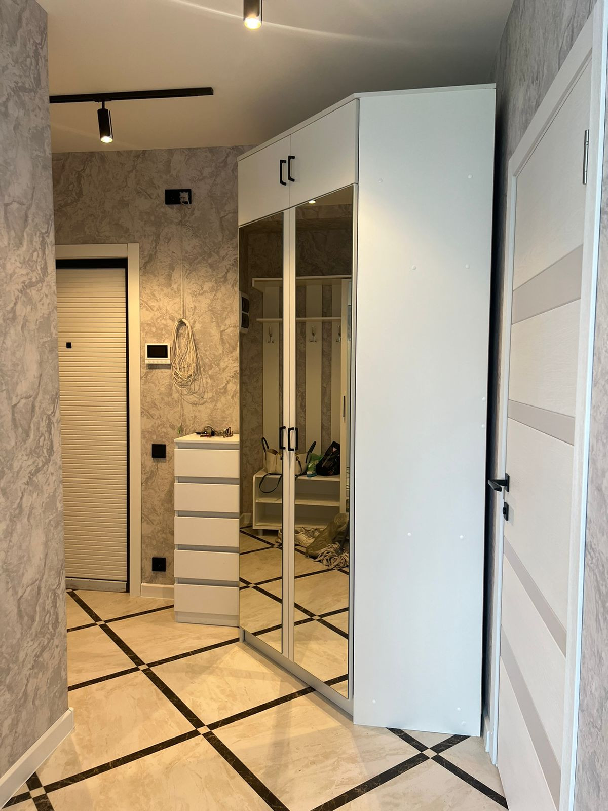 Совмещенный санузел с душевой кабиной, стиральной машиной и плиткой в потолок. Уютная прихожая с вместительным угловым шкафом и прихожей.