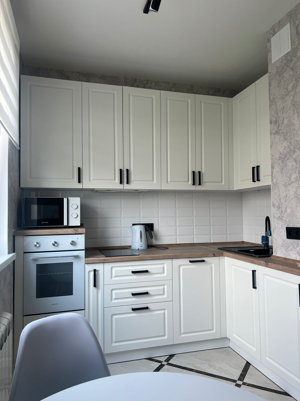 В просторной кухне - функциональное рабочее место, оснащенное современной бытовой техникой, включая духовую печь и варочную панель, посудомоечную машину под единой столешницей, вытяжку, двухкамерный холодильник, СВЧ, чайник.