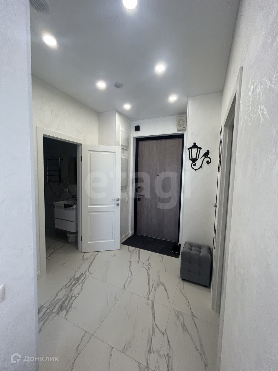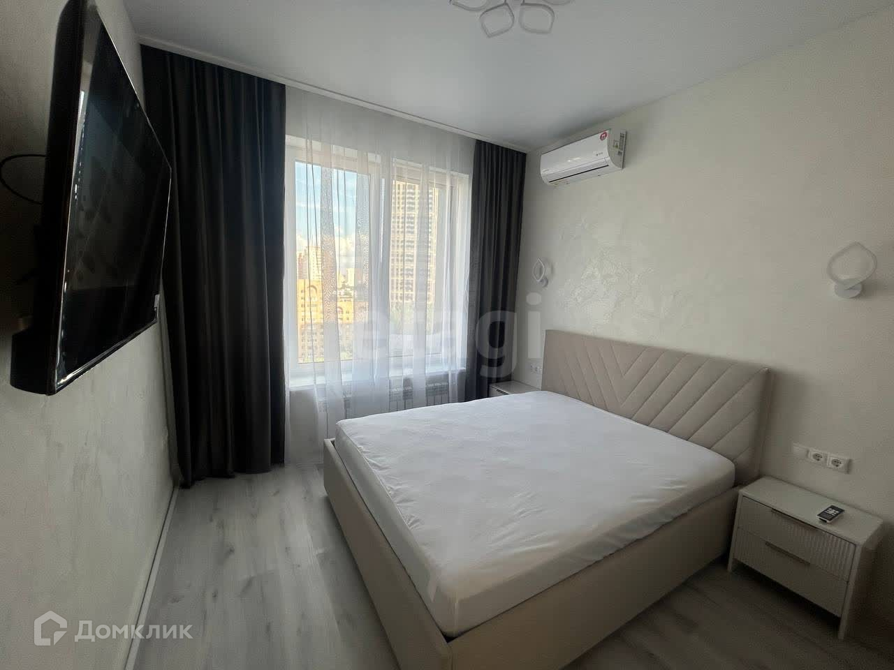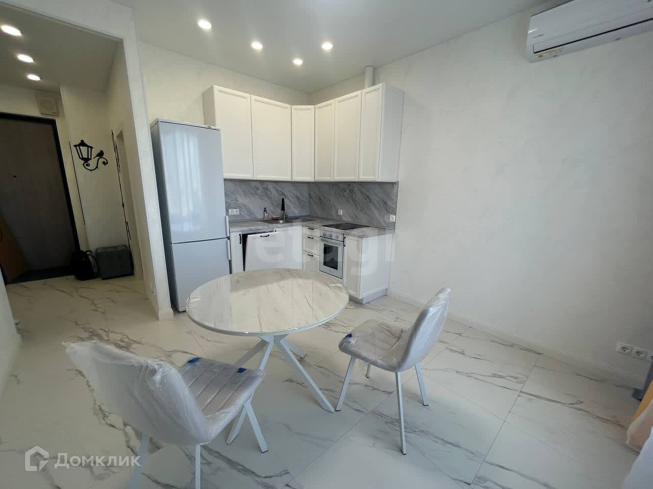 Квартира с дизайнерским ремонтом, бытовая техника и мебель есть. В уютной спальне стоит двуспальная кровать, комод для хранения вещей, и кондиционер. Светлая кухня оснащена всей бытовой техникой и кондиционером, так же имеется обеденный стол. Санузел совмещенный, в белый тонах, подчеркивая основной стиль, всей квартиры. В прихожей находится кладовое помещение для различного пользования, в котором находится стиральная машина.