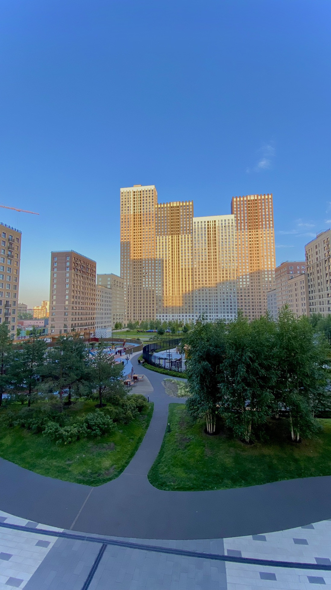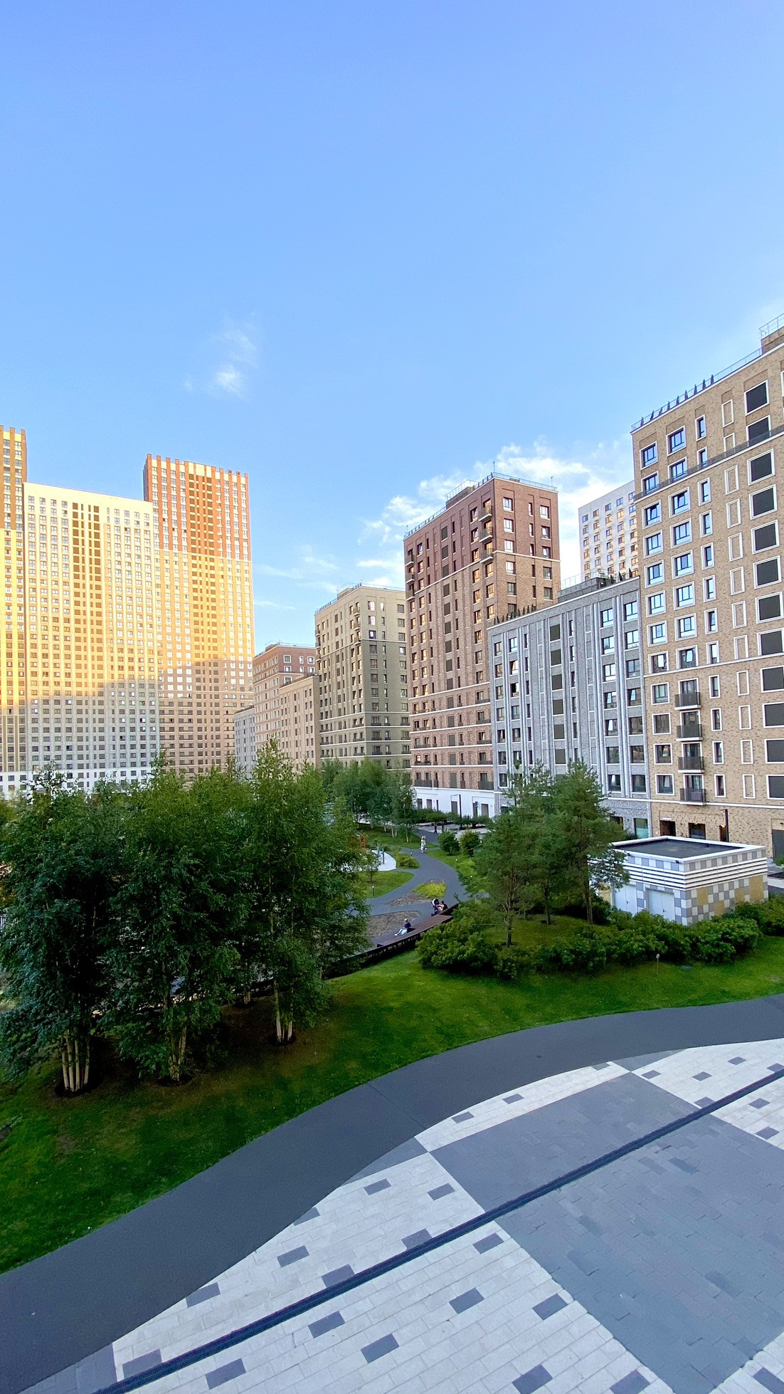 Закрытая территория с прогулочными площадками и озером на территории.