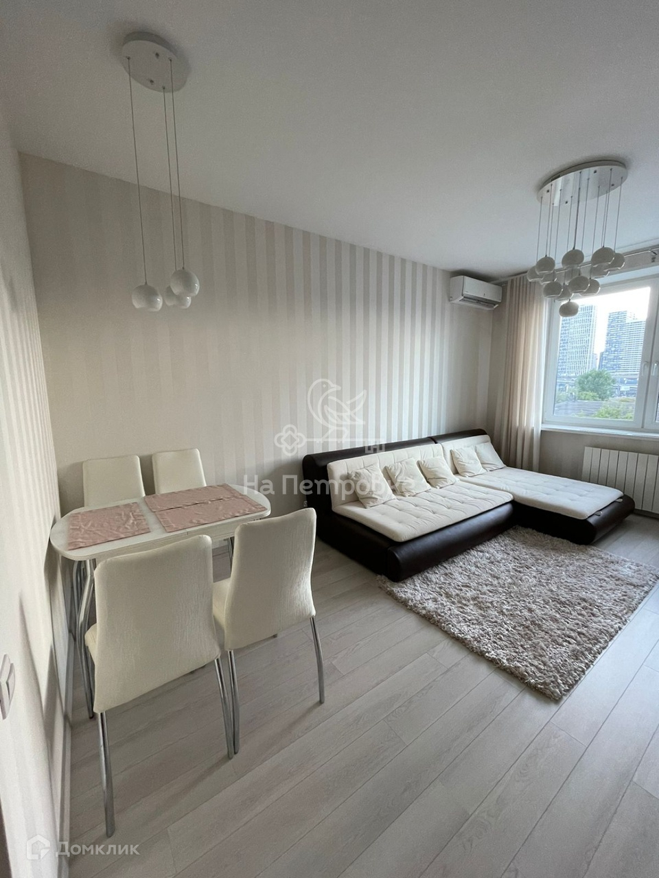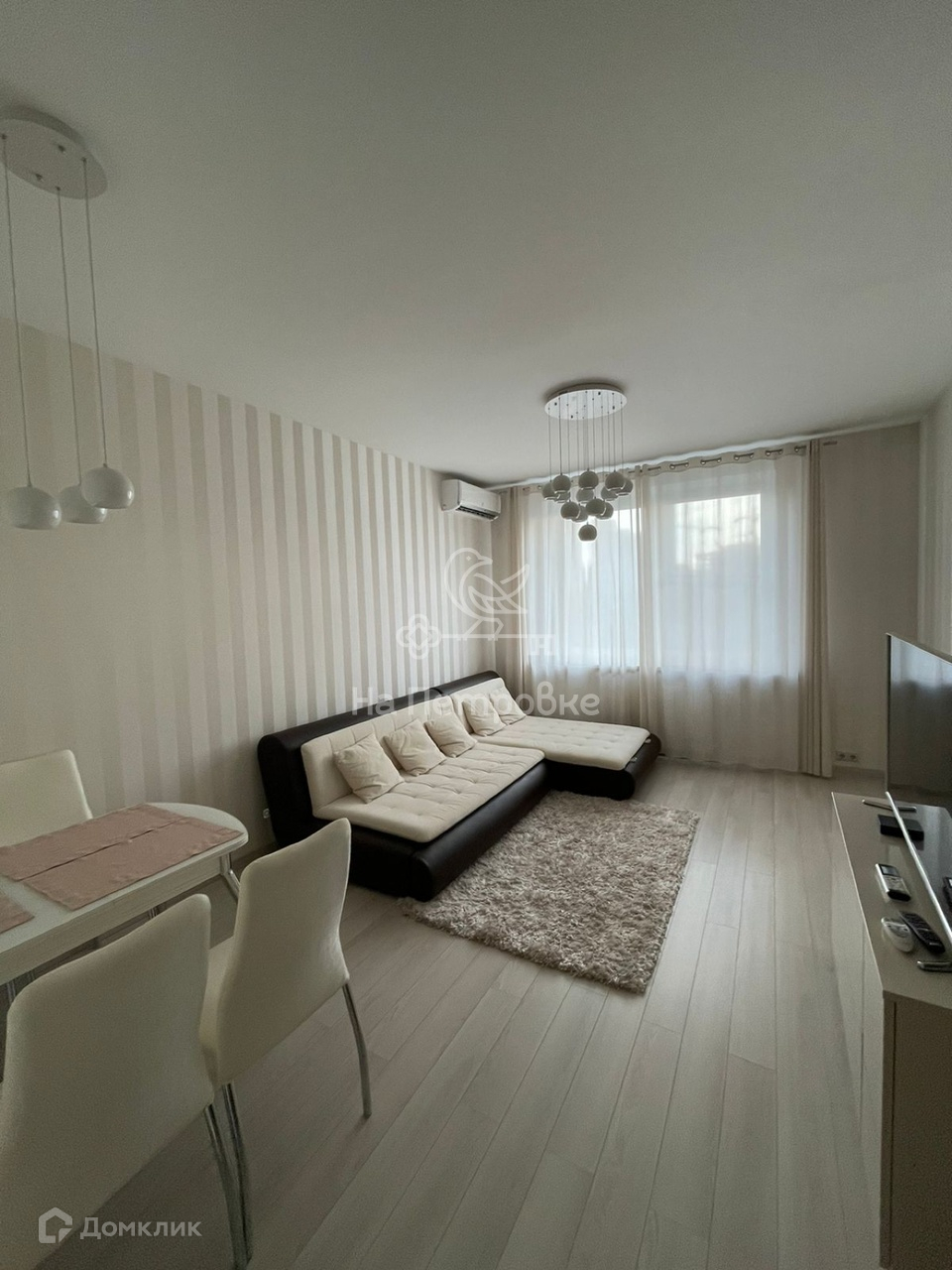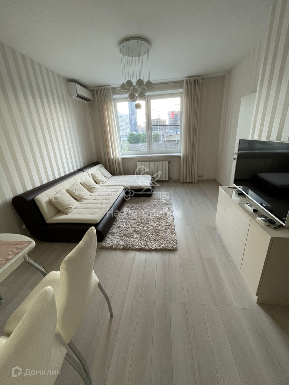 ГОСТИНАЯ: с большим панорамным окном разделена на зоны отдыха с раскладным диваном, также с вместительной нишей в низу и гостиной с обеденным раскладным столом, кондиционер +тумба с большим телевизором.