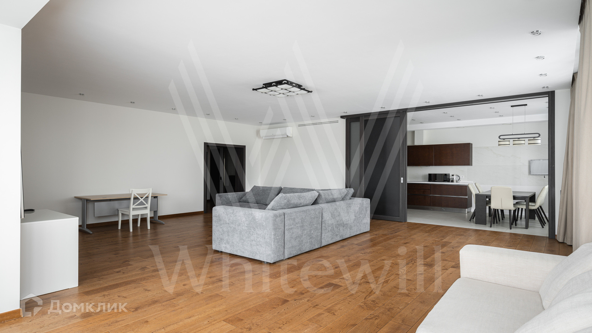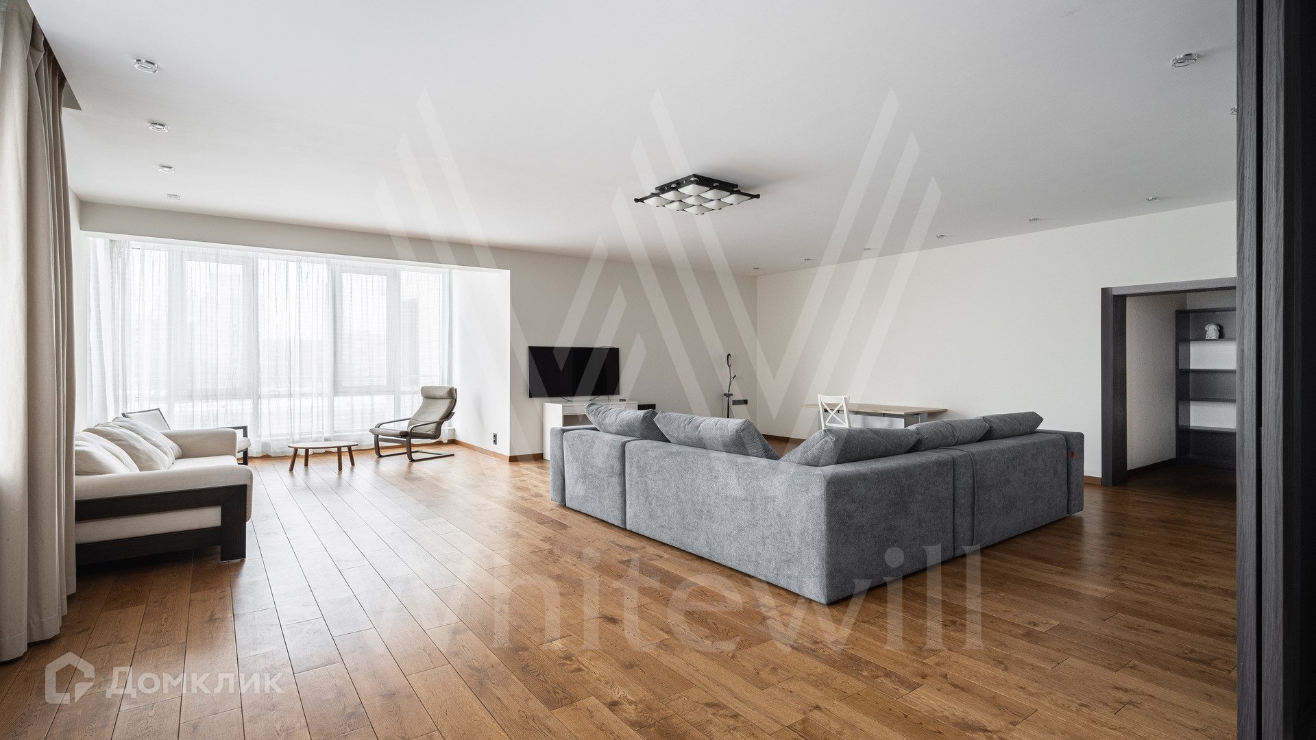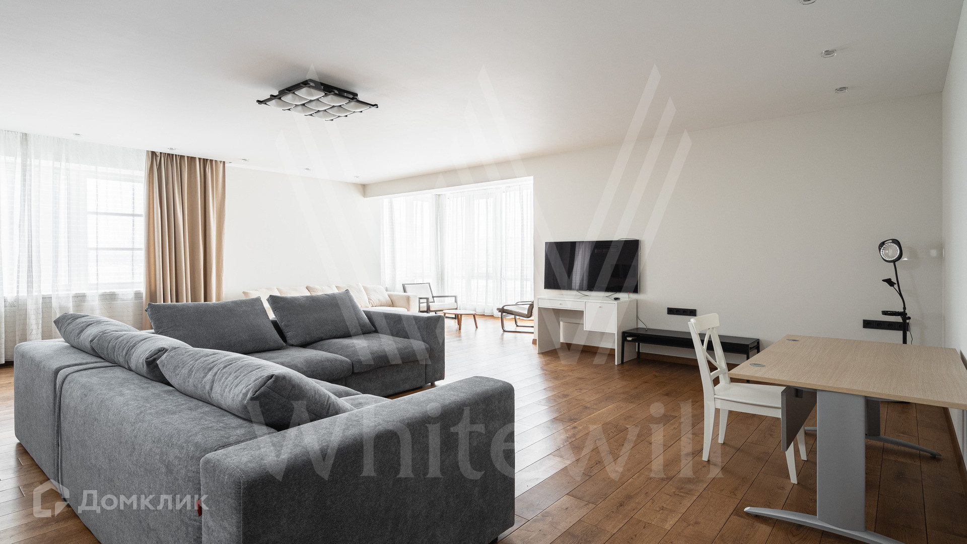 В квартире спланирована просторная гостиная с выходом в кухню-столовую, 2 спальни с двуспальными кроватями, гардеробная, лоджия, санузлы, в которых уложен подогрев полов и установлены бойлер, душевая кабина, ванна, и постирочная со стиральной и сушильной машиной. Из окон открываются виды на набережную. В стоимость аренды входит машиноместо.