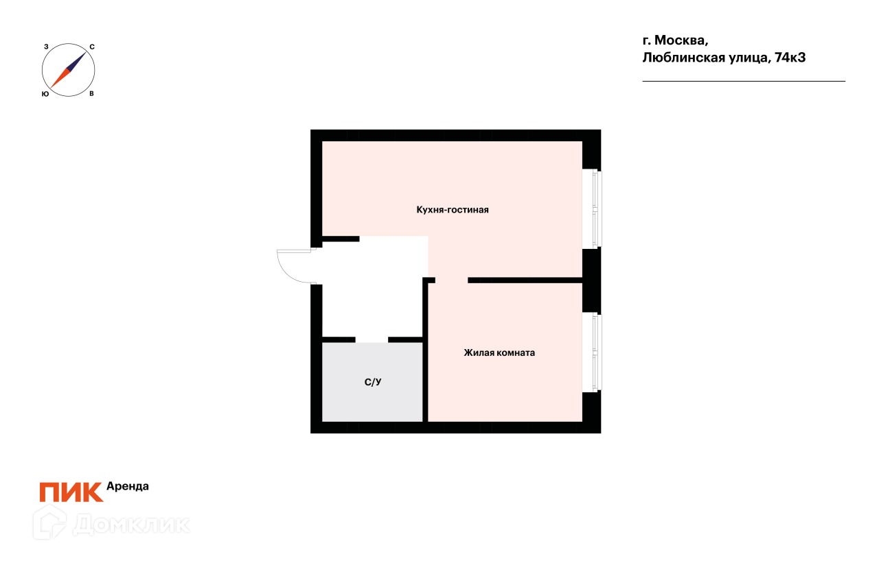 1-комнатная квартира, 31.5 м2, в аренду на длительный срок в Москве, Люблинская улица, 74к3