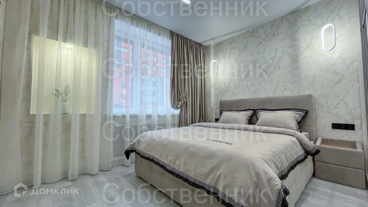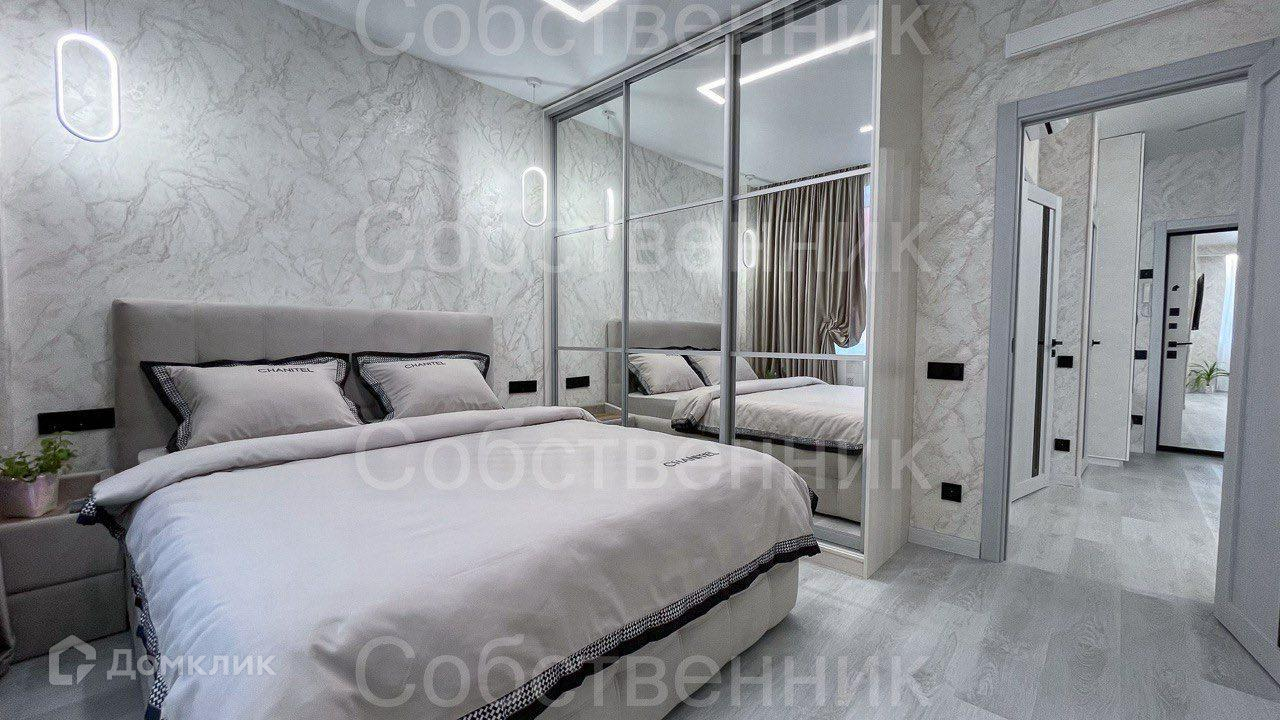 В спальне удобная и комфортная 2-х спальная кровать, шкаф-купе и телевизор.