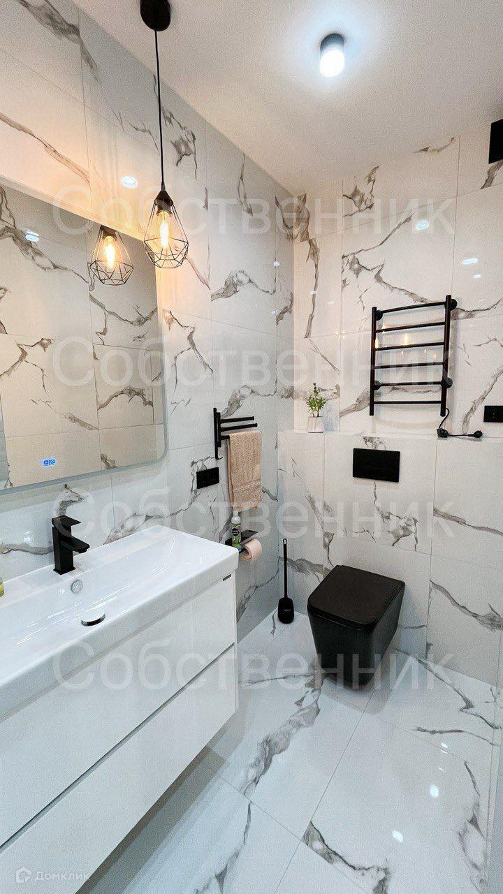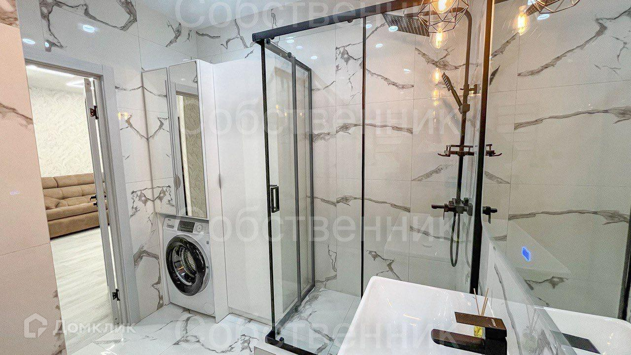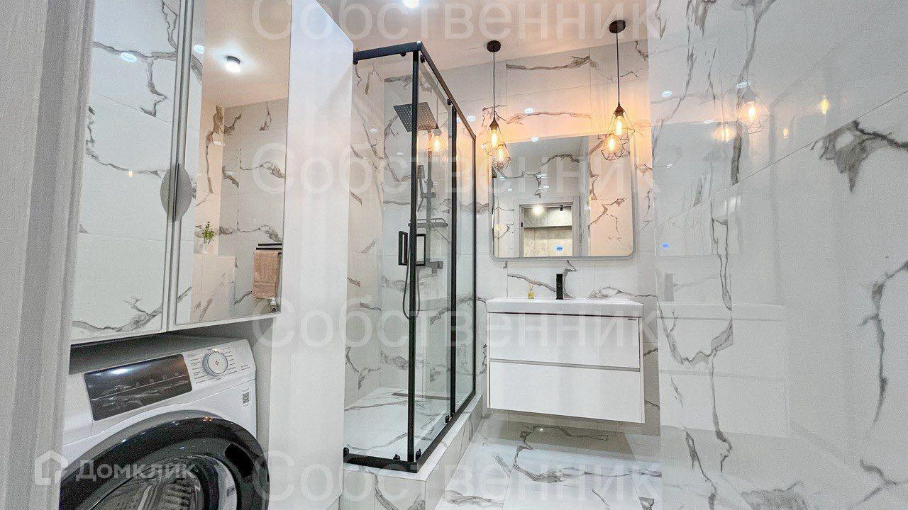 Ванная комната с душевой кабиной и качественной эстетичной сантехникой.