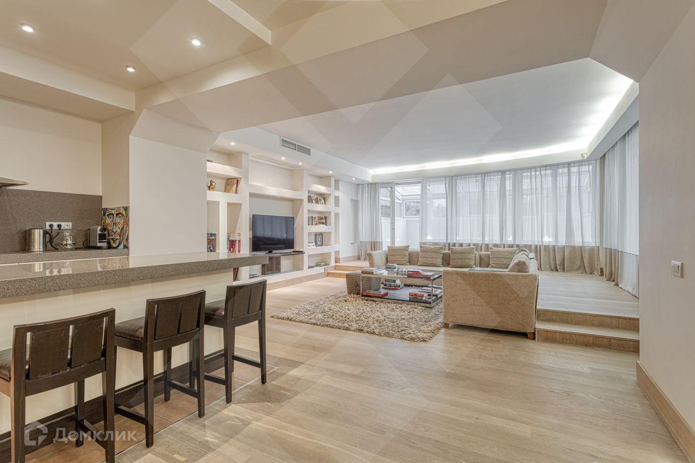 Интерьер квартиры создан по индивидуальному дизайн- проекту, с использованием только экологически чистых, натуральных отделочных материалов. Просторная гостиная- студия с 2 выходами на остекленные террасы (бронированные стекла) хорошо зонирована: зона столовой, кухонных остров с встроенной бытовой техникой Gaggenau, зона чилаут: уютная диванная группа перед тв.  2.5 с/у оборудованы душевой кабиной, ванной, биде, плиточные зоны подогреваемые. Есть 2 гардеробные, постирочная комната, система пожаротушения, принудительная приточно- вытяжная вентиляция с функцией очистки и увлажнения воздуха, кондиционирование.