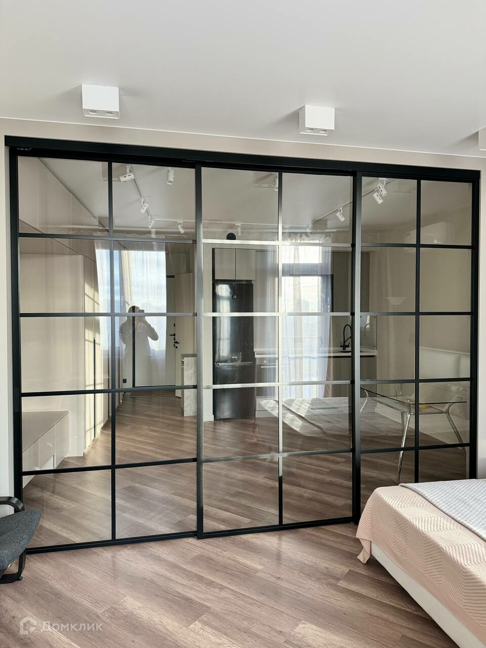 Из бытовой техники есть все необходимое. Особенности планировки включают две зоны- кухня гостиная и спальная зона, отгороженные друг от друга стеклянной, раздвижной перегородкой.