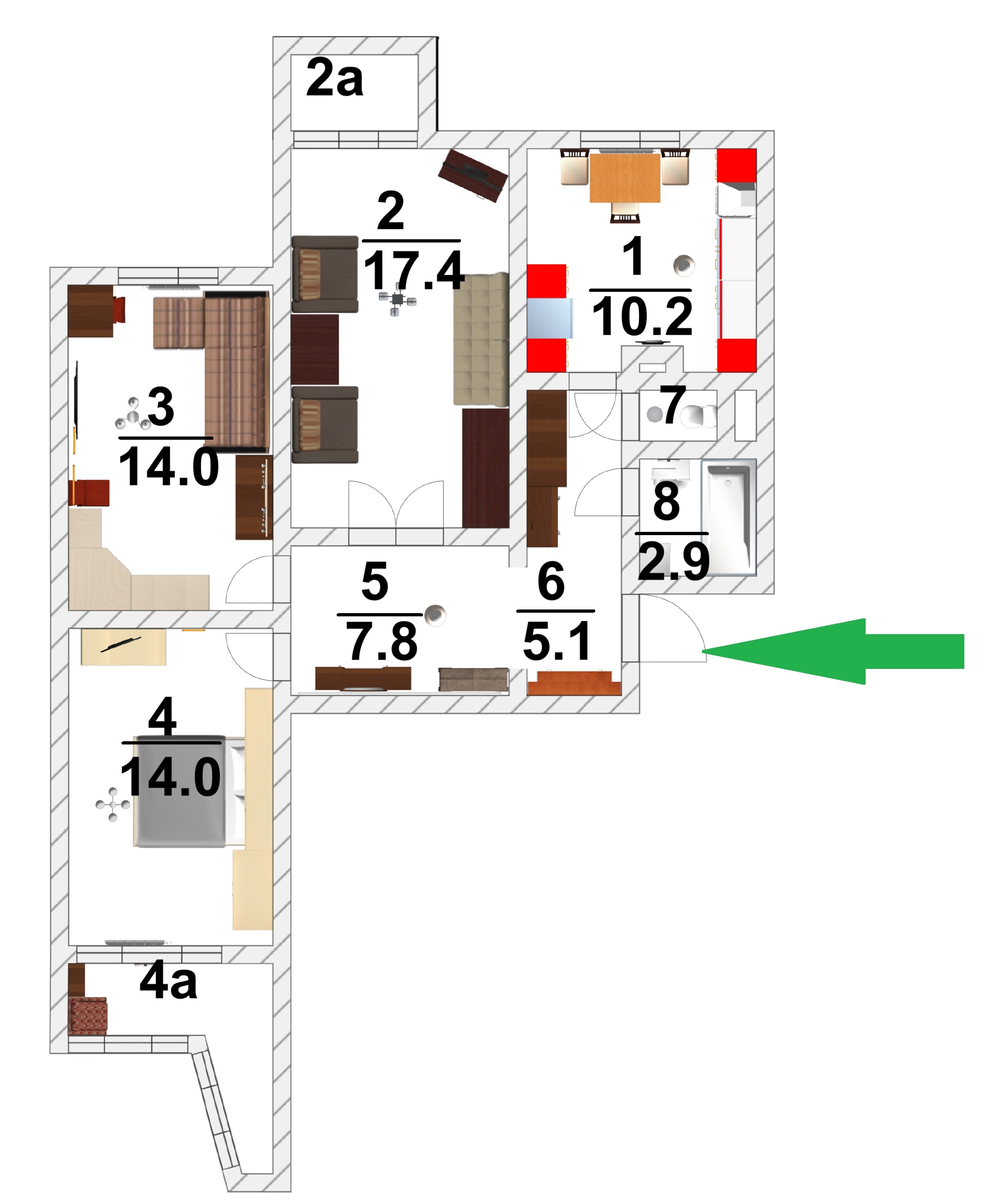 Жилая площадь 45.4 м2