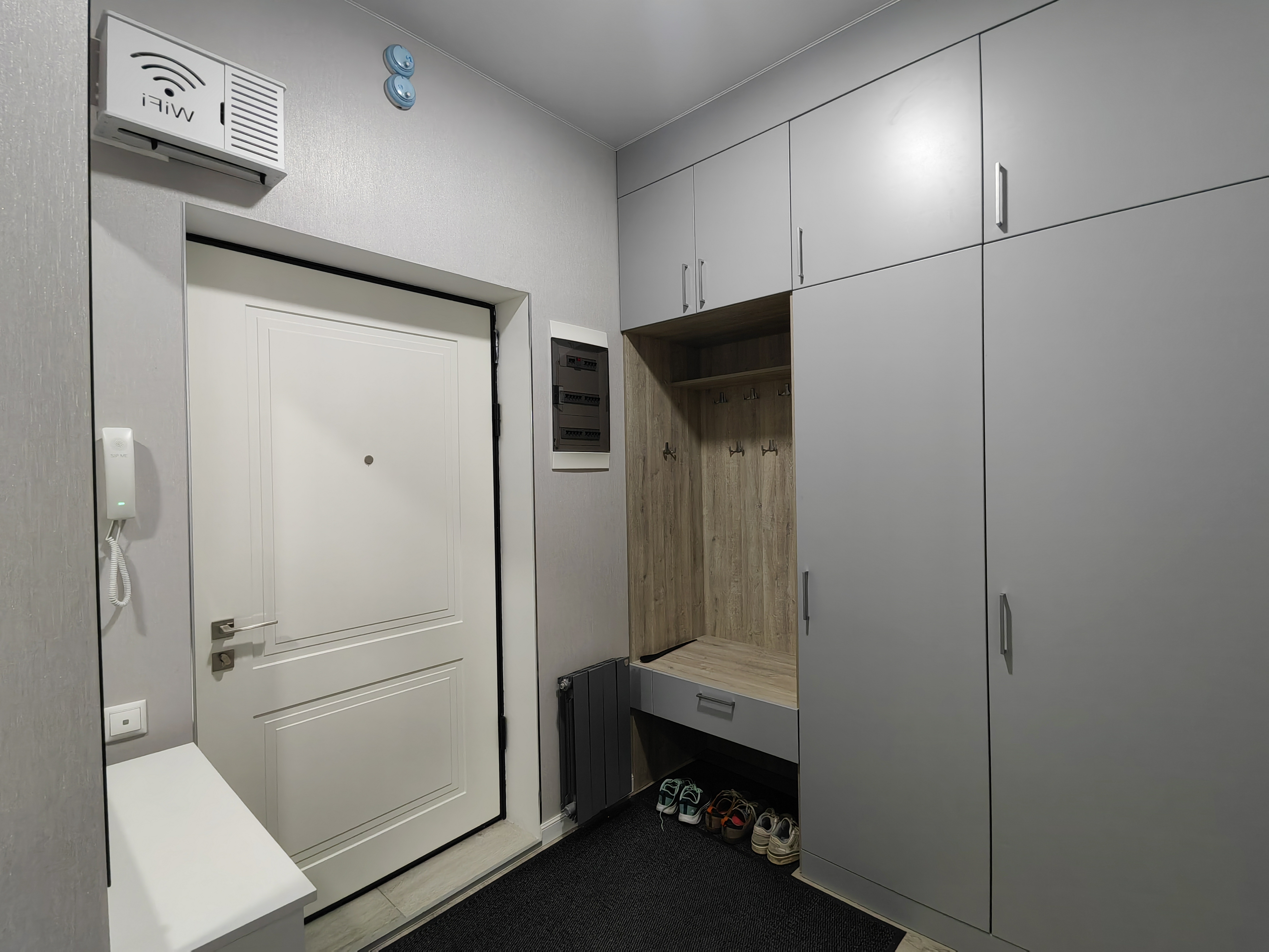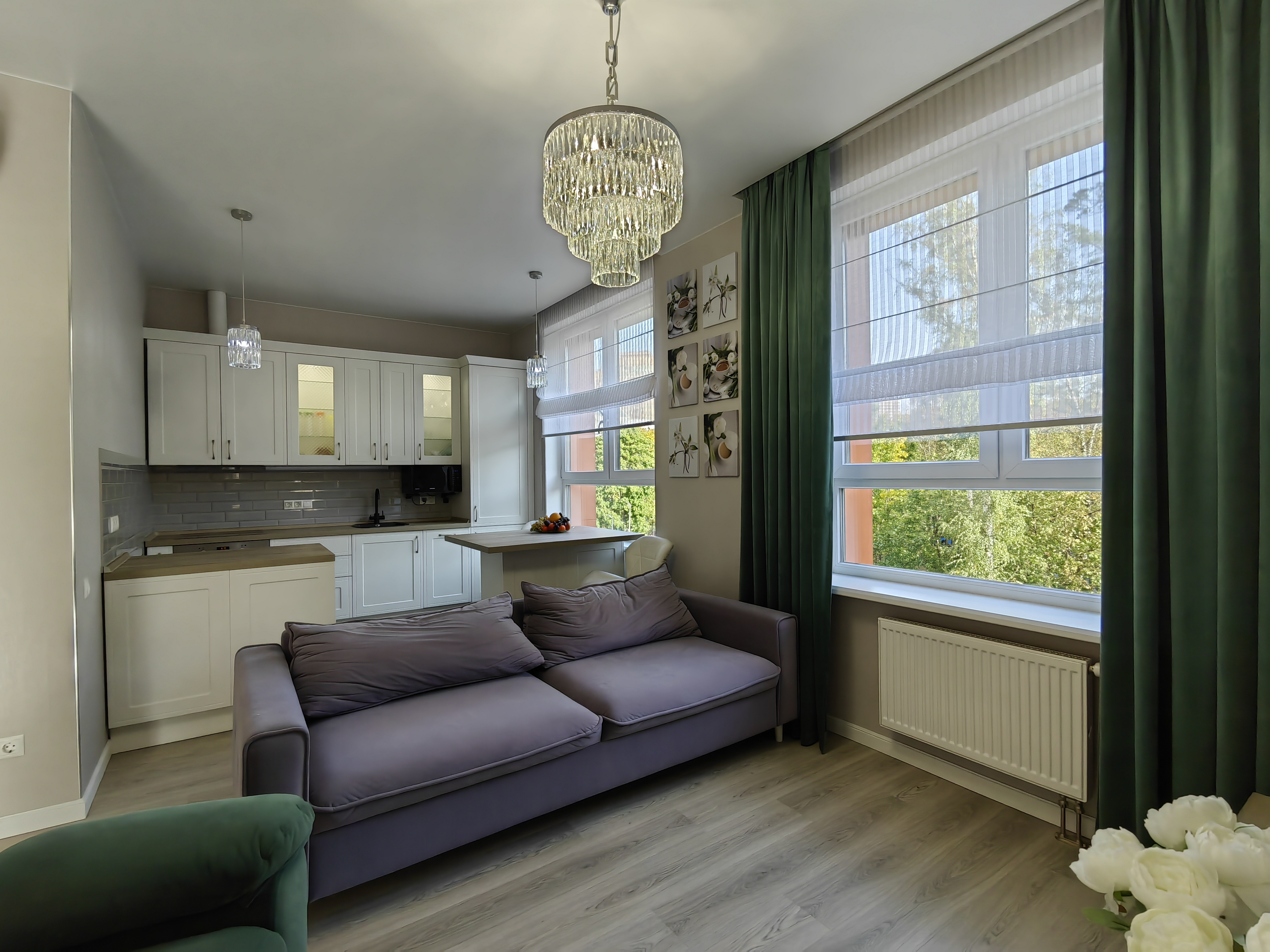 Квартира оборудована удобной, современной встроенной мебелью и бытовой техникой (2 кондиционера, стиральная машина с сушкой, индукционная варочная панель, вытяжка, посудомойка, встроенный холодильник, телевизор, микроволновка). Есть вместительная кладовка для большого количества вещей, две изолированные комнаты, одна из них - спальня, вторую можно использовать как спальню, детскую или кабинет, просторная кухня-гостиная с обеденной зонойдля небольшой семьи, так и для приема гостей.