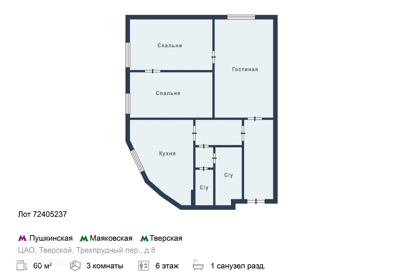 3-комнатная квартира, 60 м2, в аренду на длительный срок в Москве, Трёхпрудный переулок, 8