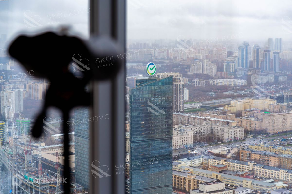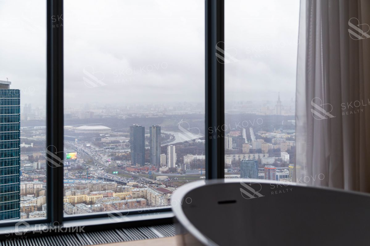 Квартира расположена на 66 этаже 85-этажного дома. Из окон открывается вид на комплекс Moscow City, Поклонную гору и Лужники