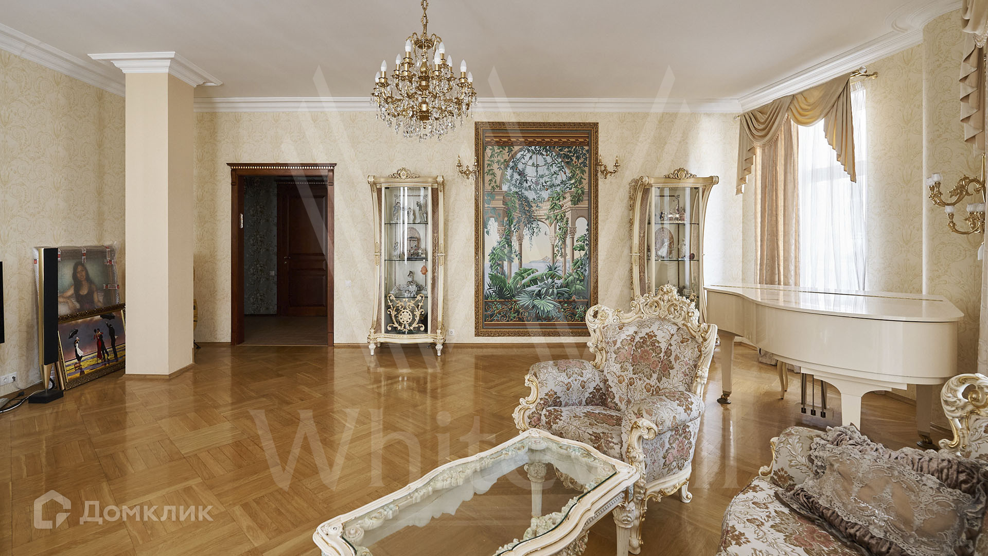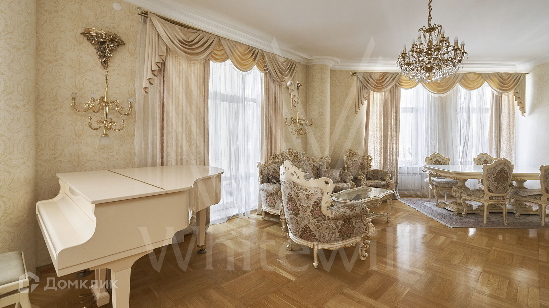 ID 2 266 Просторная квартира с 3-мя спальнями и террасой в доме на Старом Арбате. Квартира общей площадью 192 м² расположена на 3-м этаже. Выполнен ремонт в классическом стиле в светлых тонах, на полу уложен паркет, потолки высотой 3,3 метра украшены хрустальными люстрами. В гостиной установлен белый рояль.