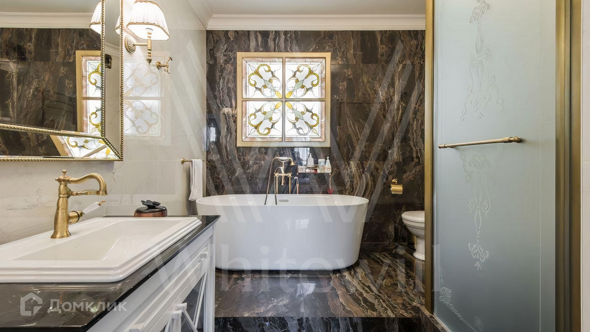 В отделке использован натуральный камень и элементы из латуни, интерьер украшен картинами.