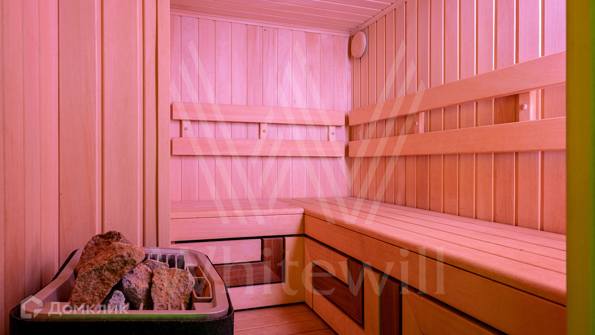 Цокольный этаж: кладовое помещение, постирочная комната с местами хранения, гардеробная, санузел с душевой и сауна.