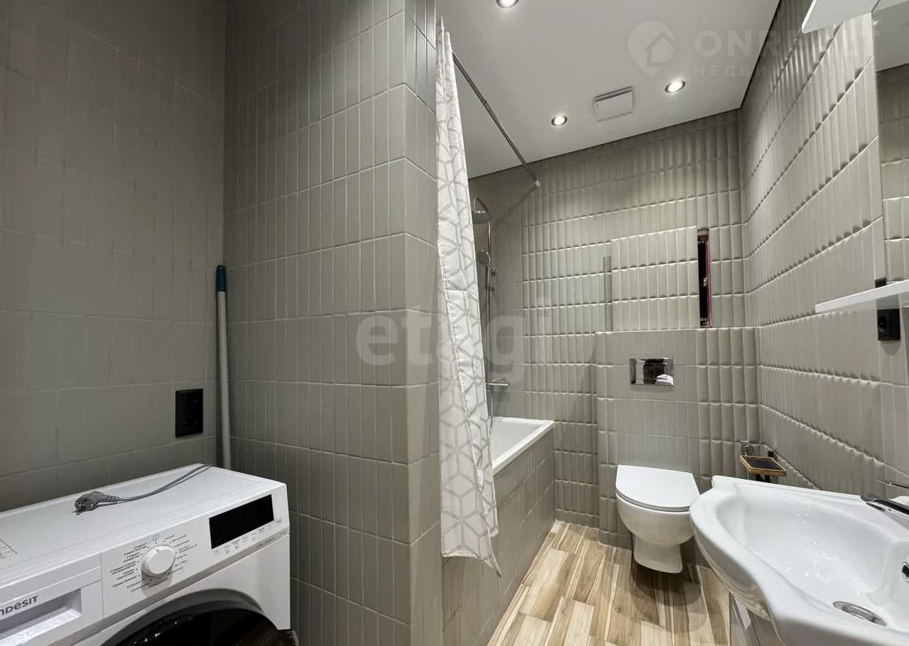 Санузел совмещённый, в нём размещена стиральная машина с функцией сушки белья.