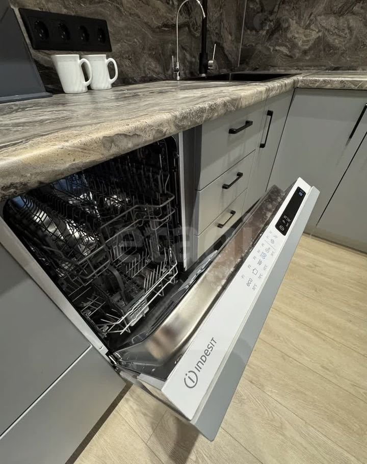 Кухня полностью укомплектована всей необходимой техникой: индукционной плитой, духовым шкафом, посудомоечной машиной, микроволновой печью и системой фильтрации воды.