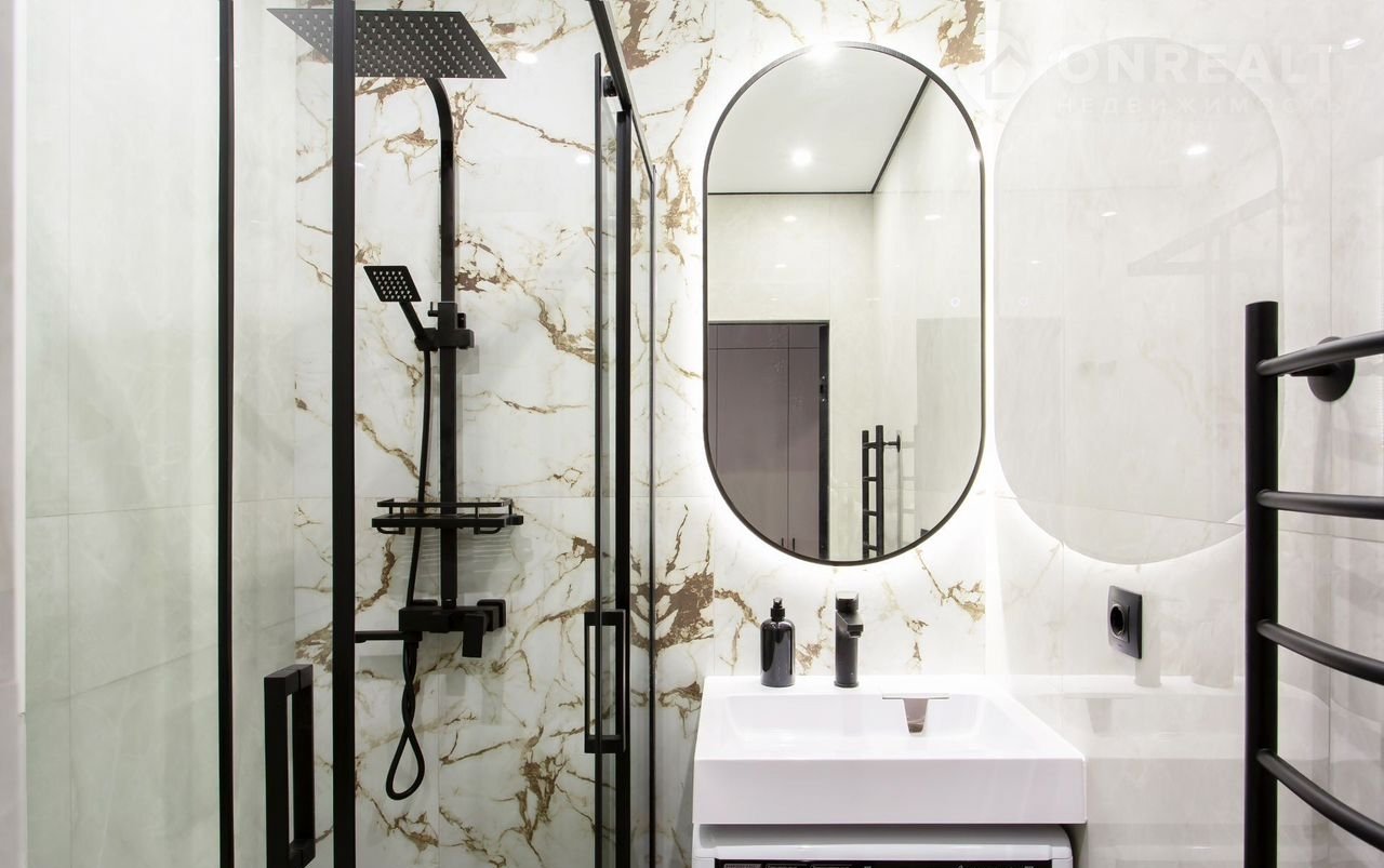 Ванная комната: функциональный санузел с душевой кабиной, раковиной, зеркалом с подсветкой и стиральной машиной. Отделка из керамогранита под мрамор.