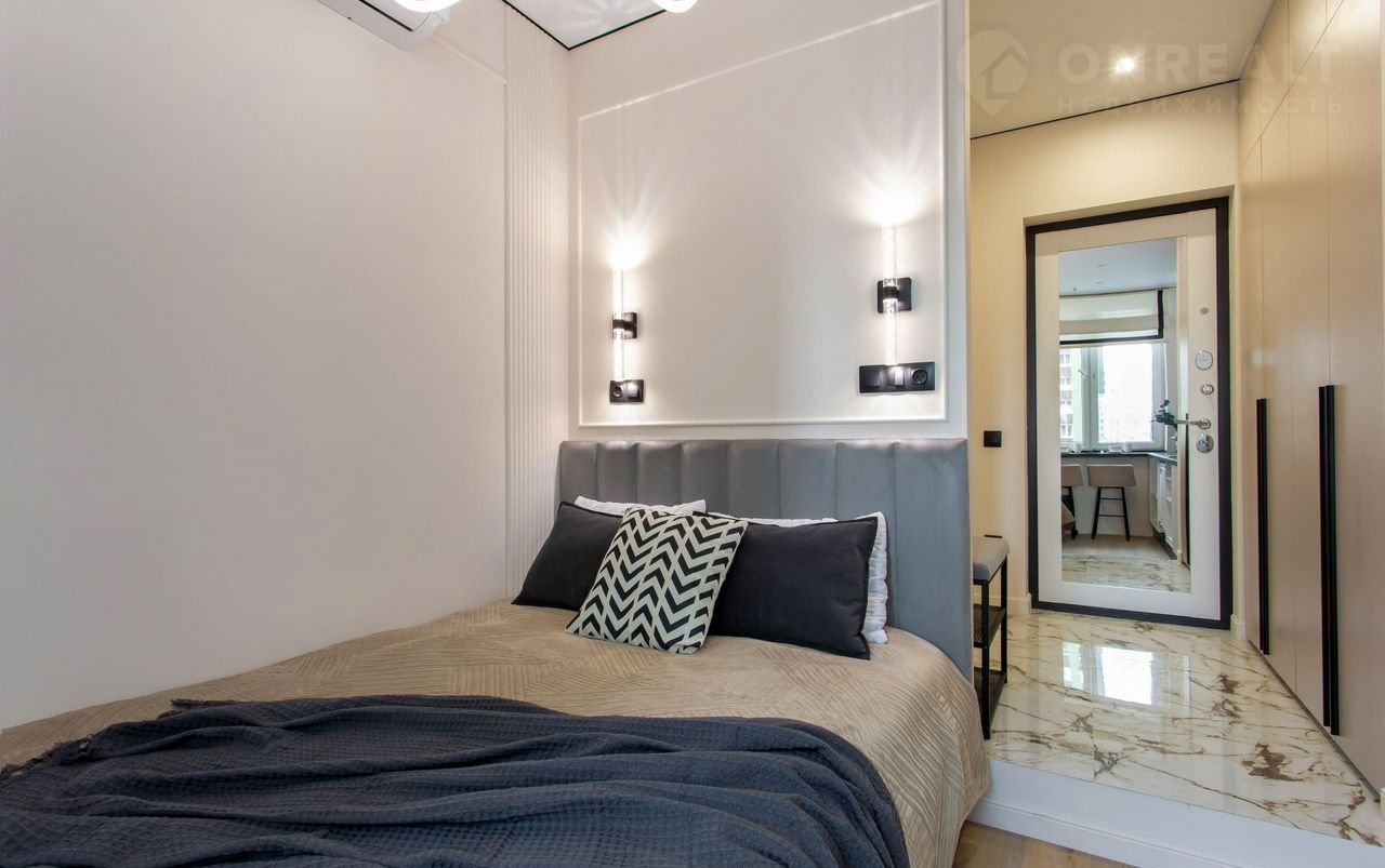 Спальная зона: уютная двуспальная кровать с мягким изголовьем. Стильные бра создают комфортное освещение.