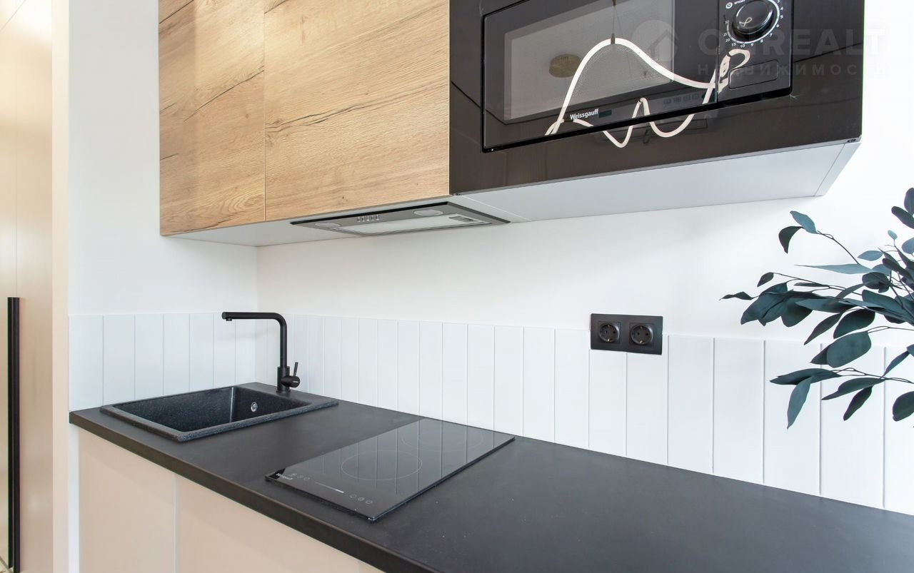 Кухня: полностью оборудованная кухня с современной бытовой техникой: индукционная плита, микроволновая печь, вытяжка, холодильник.