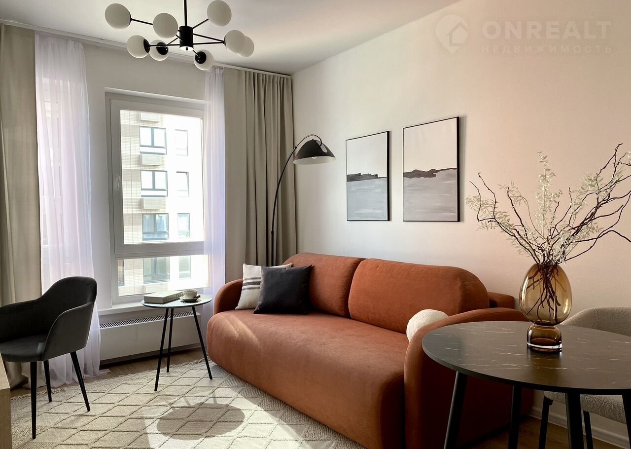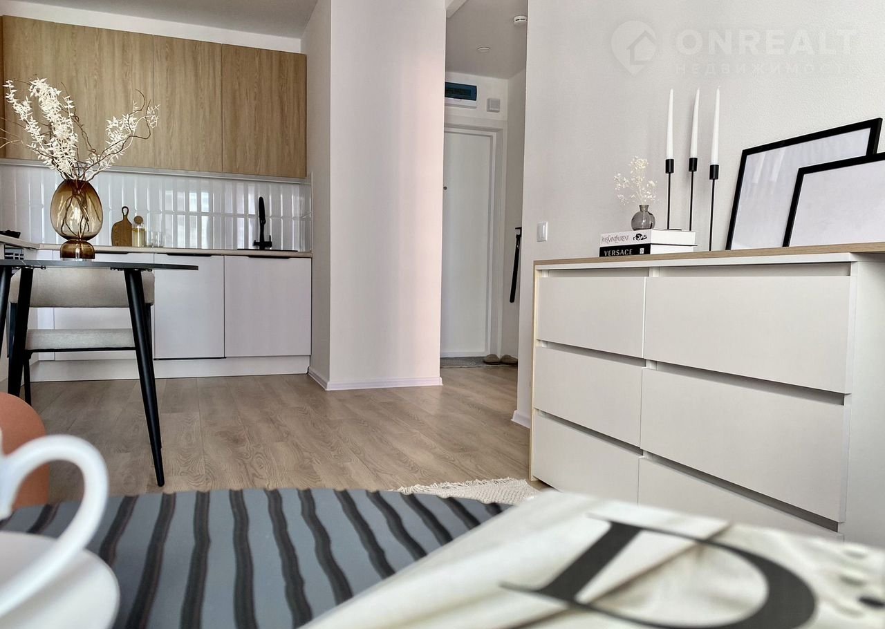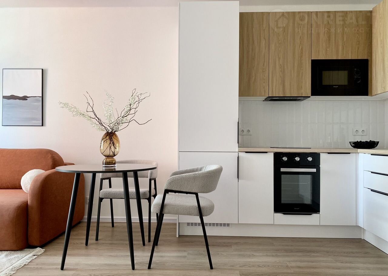 Площадь — 35 м², одна изолированная комната, кухня-гостиная, санузел и прихожая. Вся техника встроенная: вместительный холодильник, посудомоечная машина 45 см, стирально-сушильная машина, духовой шкаф, СВЧ-печь. Комфорт жильцов для нас на первом месте.